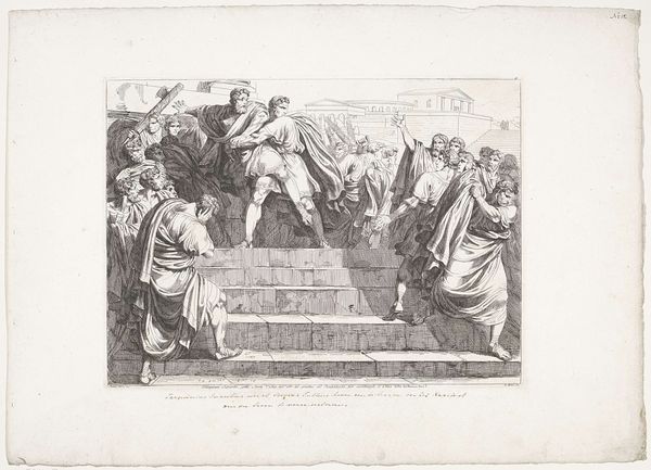 Editor: Here we have Bartolomeo Pinelli's ink drawing, "Horatius Cocles Killing His Sister," created in 1818. The flurry of figures immediately conveys chaos. What’s your perspective on the story Pinelli is trying to tell us here? Curator: Oh, this one gets the blood pumping, doesn't it? I find the energy in Pinelli's lines almost violent. See how he renders each figure with this incredible, almost frantic, detail? You get swept up in the raw emotion. Legend says Horatius killed his sister for mourning the enemy, prioritizing Rome above kin. Pinelli isn't just showing an event; he's digging into the heart of civic duty versus personal feeling. Do you sense any hesitation in Horatius' stance? Editor: I see the tension in his posture; he doesn't appear resolute. So, is Pinelli questioning the glory of ancient Rome? Curator: Perhaps. Or he’s revealing the cracks in the foundation. It's easy to get lost in grand narratives, but Pinelli forces us to look at the brutal realities, the human cost of even the noblest ideals. It reminds me of Caravaggio - dramatic storytelling, unafraid of showing the grit. Are there details that jump out at you? Something you find striking in Pinelli’s composition, beyond the main subject? Editor: I’m struck by how everyone is crowded together – almost claustrophobic. But it makes the central action that much more arresting. It feels like a turning point for the city. Curator: Exactly! He has masterfully used the human form to talk about culture, history and power. I think next time I teach narrative-art, I will focus my class on this powerful drawing. Editor: I will certainly look at history paintings with new eyes.