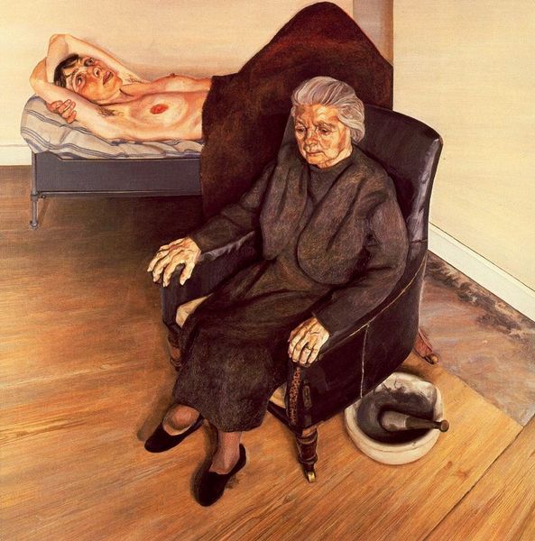 Lucian Freud made this painting of his mother resting sometime in the later part of his life. It’s oil on canvas, and you can tell he’s really digging into the possibilities of what oil paint can do. Look at the way he builds up the surface of her face. It’s like he's sculpting with color, a kind of fleshy topography. The skin isn't smooth; it’s a landscape of wrinkles, shadows, and delicate pinks. The marks aren’t hidden, they’re all on the surface, little jabs and strokes that make up the whole. And then there's that paisley pajama, flat and patterned against the sculptural mass of her body. That contrast! For me, this painting is a bit like a Chaim Soutine, but more intimate. Both artists share a similar approach to the materiality of paint and the visceral nature of representation, yet Freud brings a personal, almost tender, touch to his portrait. It’s a conversation across generations, about seeing, feeling, and the endless possibilities of paint.