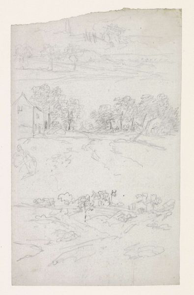 Editor: This is "Boerenhuis onder bomen met boerin," or "Farmhouse under trees with farmer's wife," by Piet Meiners, likely created between 1867 and 1903. It’s a pencil drawing. The sketchiness creates this immediate sense of a fleeting moment, a quick capture of a landscape. How would you approach an interpretation of this work? Curator: I would draw your attention first to the deployment of line and the artist's emphasis on form. Notice how the structural integrity of the farmhouse is suggested through the careful, almost geometric rendering of its roofline. The trees, in contrast, are conveyed through a softer, more diffused application of the pencil, creating a textural interplay. Consider also how the composition leads the eye from the denser cluster of forms on the left, toward the relative openness on the right, balanced by the verticality of the more distant trees, do you notice this too? Editor: Yes, I see that now. The placement almost creates a diagonal movement. And I hadn't really considered how different the pencil work is for the house versus the trees. What about the figure; how does that impact the work structurally? Curator: Ah, excellent question. The figure, almost gestural in its execution, acts as a bridge, a mediating element between the built environment and the natural world. Consider her scale relative to the farmhouse: the artist isn't aiming for accurate proportional representation. The function seems primarily to be that of a visual device; a method to add depth using light. The very lack of sharp detail creates a sense of harmonious whole. Do you see that? Editor: Yes, absolutely. Focusing on those core formal elements really changes my perception. I appreciate understanding how the artist uses these lines and shapes. Curator: Indeed. Close examination reveals an understanding that can reshape how you perceive these details and, ultimately, what they contribute to the overall composition.
