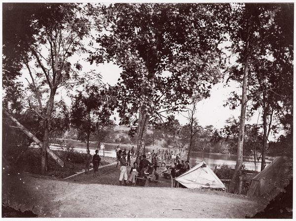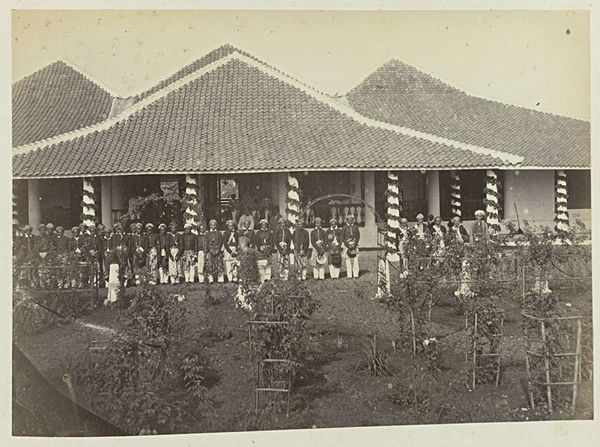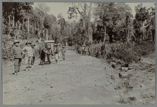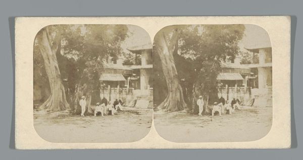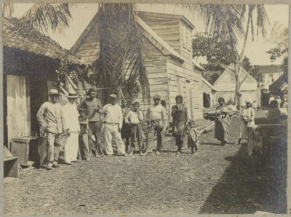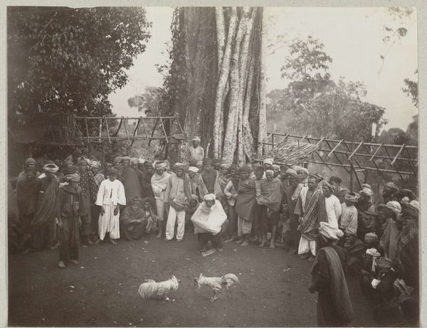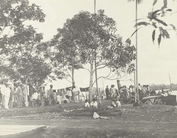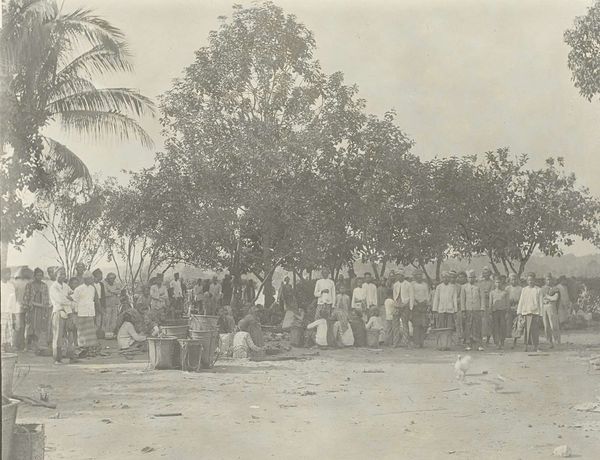 Curator: This photograph by Hendrik Doijer, taken between 1903 and 1910, captures a Javanese market scene. It's titled "Javanenmarkt onder kankantree op 'Ma retraite'". The scene unfolds under the expansive canopy of a Kankan tree, giving the space a uniquely enclosed and vibrant feeling. What are your initial impressions? Editor: Hmm, the overwhelming first impression is…crowded. But not unpleasantly so. It feels like a hive of activity, a little enclosed world bustling beneath that massive tree. There's a peaceful kind of chaos, you know? The contrast of light and shadow is also really grabbing me. It is as if everything teeters in the balance in time. Curator: Indeed, the interplay of light is crucial to understanding its structure. The sharp contrasts lend a documentary feel while simultaneously emphasizing the dense layering within the frame. Notice how Doijer uses the branches to frame the figures, creating depth, particularly to how each small group functions on their own. Editor: Absolutely, the composition leads the eye from the brightly lit figures in the foreground to the softer, more muted background. It's almost as if the artist is pulling us into the heart of the market, inviting us to be part of the gathering. It evokes such an intimacy within all that scale, and the stillness of the scene does betray that it’s not painted. Curator: The stillness arises directly from its medium of photography. Given the context of Orientalism, this photographic treatment avoids the heightened drama or exaggeration typical of painting within the period. Instead, the documentary effect may subtly challenge perceptions of the Javanese peoples. Editor: That makes perfect sense. Knowing a bit about Doijer, his deep affection for Java makes the case. There's no denying the Orientalist lens but, looking closely, I see a gentleness, almost a reverence, in the way he captures these people. Curator: Precisely, and perhaps Doijer seeks to emphasize an idealized vision of Javanese life? Editor: Perhaps… but to me, it also highlights something enduring. Beyond any idealized image, this photograph captures the enduring essence of community, of people gathering and connecting. Curator: A very astute point, one that emphasizes how formal visual analysis might open to broader social meaning. Editor: Right, art isn't just about technique and composition—it's about the human story behind it all, and what that image is still asking for us today.