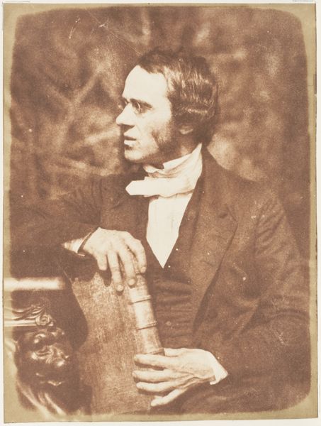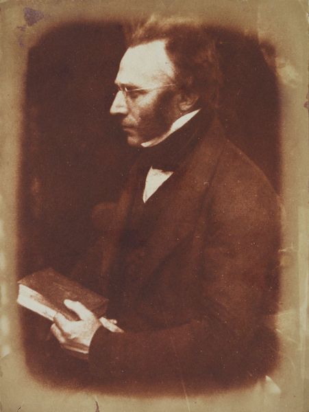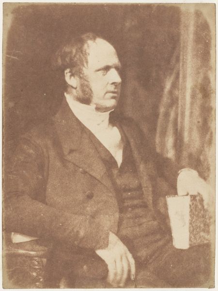 Editor: This daguerreotype, simply titled "[Man]", was created by Hill and Adamson sometime between 1843 and 1847. I’m immediately struck by the sitter’s intense gaze and how the light softens the details, almost blurring the background. How do we read this portrait within its historical moment? Curator: Precisely! This image emerges during a pivotal era grappling with notions of identity, representation, and the power of the burgeoning photographic medium. Consider the sitter's pose – formal, yet hinting at inner contemplation. It’s a very Romantic depiction. How does the act of being photographed, especially with the daguerreotype’s lengthy exposure times, influence our understanding of performance and selfhood? Editor: So, the sitter’s social role could have influenced this performance? Curator: Absolutely. Understanding 19th-century Scottish society and the sitter's potential position within it adds layers of interpretation. Hill and Adamson were keen to document various levels of society. Who gets to be seen, and how are they presented? Are there visual cues suggesting status, intellect, or perhaps even dissent? Does his engagement with the book suggest social capital or a quest for it? Editor: That is thought provoking. I hadn't considered how access to books relates to someone’s social and political context. Is it unusual to not include more biographical detail? Curator: Perhaps it speaks to universal themes - not just *who* he was, but also the inherent value in observing his very being. The image then transforms into a powerful assertion that the working classes are equally deserving of being seen and documented as the bourgeois. Editor: I see. The image makes me think about visibility in broader terms of representation. Thank you! Curator: Avenues for reflection are vital when considering this and similar artwork. Now, you will see how context informs visual perception.