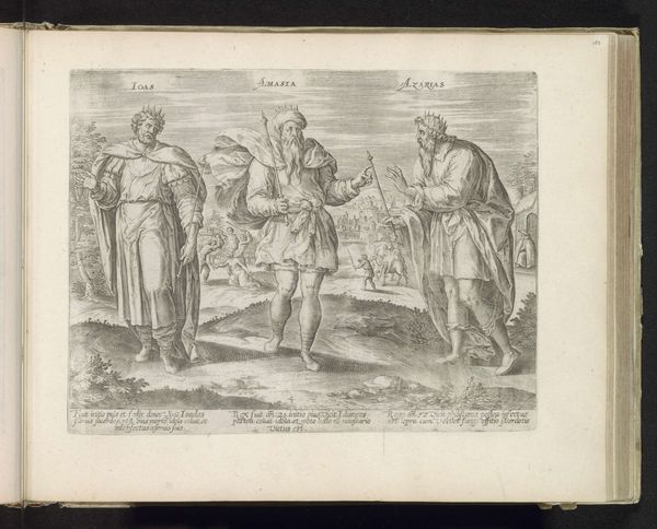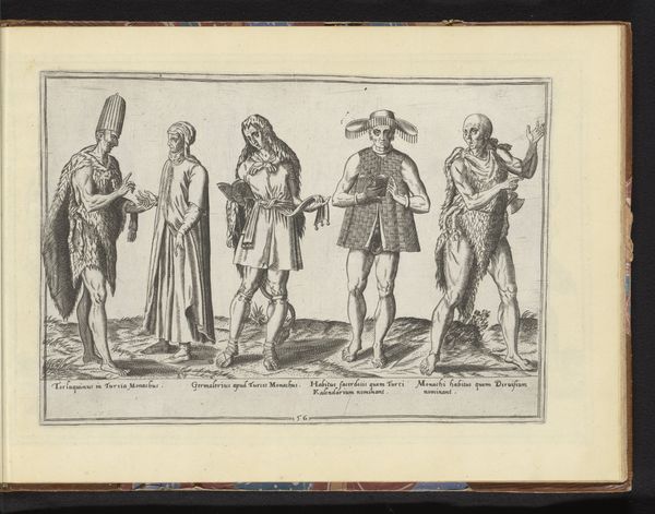 Editor: This engraving, "Drie Afrikaanse vrouwen en een man, gekleed volgens de dracht van ca. 1580," by Abraham de Bruyn, predates 1581 and is part of the Rijksmuseum's collection. I’m immediately struck by how the subjects are presented, almost like specimens. What's your perspective on this piece? Curator: The way these figures are displayed reveals a lot about the European gaze during the late Renaissance. This wasn't simply an attempt at documentation. Consider the socio-political climate: exploration and early colonialism were burgeoning. Prints like these, widely circulated, shaped European perceptions of "other" cultures. Editor: So it’s less about accurate representation and more about constructing an image? Curator: Exactly. Think about the power dynamics inherent in depicting these individuals in this manner. De Bruyn presents them as examples, specimens if you will, categorized and displayed for a European audience. Note the captions - they reduce individuals to types. How might this impact how Europeans viewed the depicted people and their societies? Editor: I hadn’t considered that the act of categorizing itself is a political statement. By labeling and presenting them this way, it creates a sense of European superiority and justifies colonial actions. Curator: Precisely. These images weren't neutral. They were tools in constructing a narrative that positioned Europe at the center and validated its expansionist ambitions. The choice of dress, pose, and even the presence of weapons serves this narrative. Consider how such readily available images solidified biases. Editor: Looking at it that way, it's quite unsettling to think about the lasting impact of these images. Thank you, I hadn't considered the deeply rooted cultural context that informed not only this artwork but also its purpose in shaping perception. Curator: And it’s a potent reminder that art rarely exists in a vacuum, it is always speaking within, and to, the social and political currents of its time.