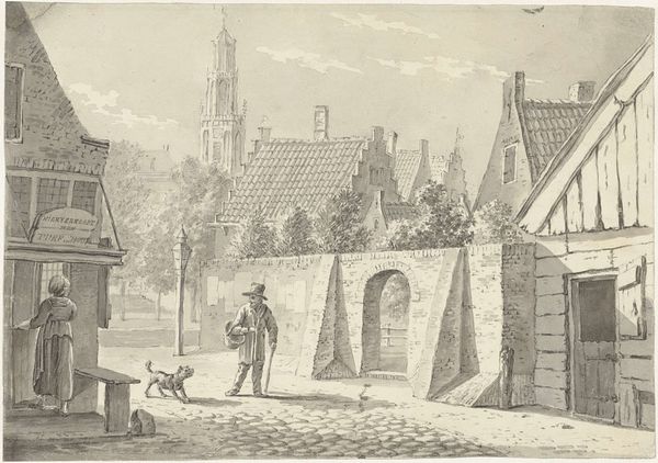Curator: Here we have "De havezathe Vechterweerd bij Zwolle in 1729" a drawing created with ink by Aert Schouman, finalized in 1749. Editor: There’s something so gentle about it. The limited tonal range creates a calming, almost ethereal atmosphere. The composition directs your eye through the estate methodically, yet…without strict rigor. Curator: The composition establishes a clear hierarchy. The gate with its detailed carvings dominates the immediate foreground, drawing us towards the primary structure of the Vechterweerd estate behind it. Note Schouman’s attention to proportion. Editor: I'm struck by how Schouman infuses symbols of Dutch affluence into a seemingly simple genre scene. Notice the carefully positioned figures and even the family dog. What story are they meant to communicate, I wonder? Curator: Precisely! The artist emphasizes line and form, notice how the rooftops are handled; that creates an intricate network of lines, a key Baroque convention. The texture achieved is striking, given the medium. Editor: The gateway certainly acts as a liminal space, both inviting entry and subtly suggesting exclusion. Perhaps it's emblematic of the Dutch Golden Age: displaying prosperity but guarding it carefully? Curator: The architectural details communicate not just wealth but civic order. This echoes core Enlightenment principles. Notice how each component, down to the ornamental spheres atop the gateposts, contributes to the whole’s visual and philosophical impact. Editor: Considering the socio-cultural backdrop, doesn't it prompt consideration of those beyond the estate walls? Curator: Good point. While Schouman's artwork meticulously renders affluence, it’s true he remains primarily preoccupied with formal presentation. Editor: In the end, it remains an idyllic scene, masterfully composed, even if it's laced with undertones. Curator: Indeed, a fascinating convergence of meticulous technique and symbolic undercurrents!