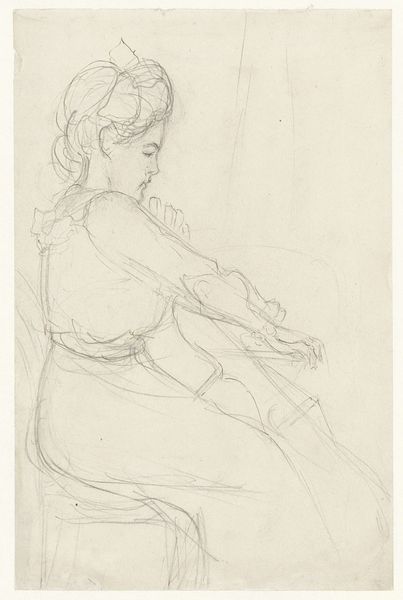 Curator: Oh, this drawing makes me think of rainy afternoons and secret whispers. The way the colours melt together – a warm embrace captured on paper. Editor: Yes, Helleu’s "Nu Féminin à la Longue Chevelure"—a drawing rendered in pencil and charcoal—conjures a very specific mood. It reflects the aesthetic interests of its time, especially regarding the representation of female bodies within intimate settings. Curator: It's quite the opposite of grandiose, wouldn’t you agree? More of a shy, intimate kind of beauty. Like seeing someone lost in their own daydream. Editor: Exactly. The woman's gaze is averted, her body turned inward, creating a sense of privacy but, of course, always from a male gaze. The question becomes: what does this level of observation reveal about societal attitudes concerning visibility and vulnerability? Curator: I see what you mean. The lines, though, feel so effortless! Like a quick sketch, but loaded with unspoken emotion. Do you get that feeling, too? The emotional residue of observation? Editor: Helleu’s use of line is striking. It invites conversation, definitely, and forces us to confront issues surrounding both voyeurism and objectification within artistic practices – in how beauty is perceived and, inevitably, commodified through representation. Curator: Perhaps that is it... there is both elegance and a tinge of discomfort present in this drawing. It's an interesting emotional collision that stays with you after the initial, easy attraction of line and beauty. Editor: It highlights the tension between personal expression and established cultural norms—we need to question this artistic gaze to critically analyse art history and to open possibilities for decolonisation of representation. Thank you for offering this opportunity for questioning. Curator: Yes, questioning the beauty! Ultimately, that’s why art pulls us back in to discover a little something more about who we were and where we might go next, both in art and in thought.