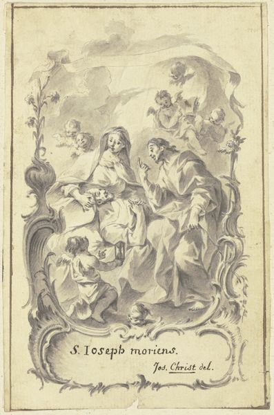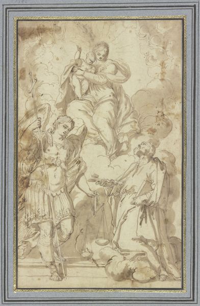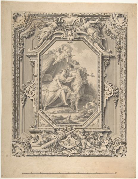 Carle Vanloo created "St. Gregory Reluctant to Accept His Election as Bishop of Rome" using pen and brown ink with gray wash, heightened with white gouache. Notice how the composition is built around a central, shield-like frame that encloses the narrative. The limited color palette creates a tonal unity, drawing our eye to the interplay of light and shadow that models the figures. This creates depth, emphasizing the drama of the moment as St. Gregory resists his elevation. Vanloo uses the visual structure of the drawing to explore power and reluctance. The architectural frame, adorned with cherubs, gives way to a scene of human emotion. Gregory’s resistance isn’t just a personal act, but a challenge to the very structure of authority. The scene creates a semiotic system where gestures and expressions convey complex meanings about duty, humility, and power, challenging fixed interpretations of religious authority. The drawing’s formal qualities—the contrast of light and shadow, the dynamic composition—function as part of a larger cultural and philosophical discourse, showing how art can question established values.