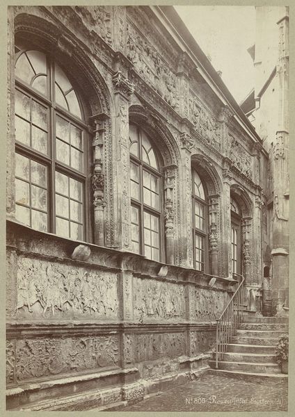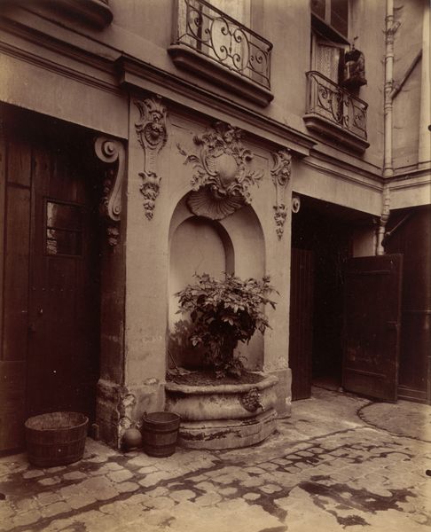 Louis-Rémy Robert captured this evocative photograph, "Village Scene, Brittany," with a paper negative sometime in the mid-19th century. The sepia tones and intricate composition draw us into a world where architecture and everyday life intertwine. Notice how Robert uses the strong diagonal lines of the building and cobblestone street to create a dynamic, almost theatrical space. The building's facade, with its detailed stonework and varied window treatments, presents a complex interplay of light and shadow. This meticulous attention to texture destabilizes any singular reading of the scene. The eye is drawn to the subtle contrasts between the rough stone and the smoother surfaces, emphasizing the materiality of the structures. Robert’s skillful use of perspective and careful arrangement of elements invites us to consider how photography can challenge our perceptions of space and representation. The image functions as a semiotic system, where architectural details and the arrangement of objects communicate deeper cultural meanings about place and history. Ultimately, the photograph offers not just a visual record but a complex meditation on form, texture, and the passage of time.