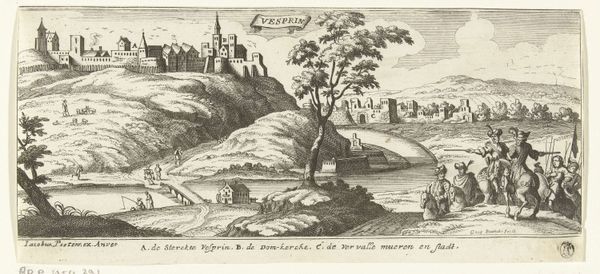 Editor: This engraving, "Gezicht op Tata," by Gaspar Bouttats, made in 1686, gives us a glimpse of a historical scene. I’m struck by how detailed the city and landscape are, almost like a map, yet the battle scene seems full of movement and chaos. How do you interpret this work? Curator: Immediately, I see a cultural record deeply embedded within the landscape and figures. The cityscape isn't merely a location; it’s a symbol of power, history, and perhaps even longing for a bygone era. Do you notice the stark contrast between the serenity of the distant view and the violence in the foreground? Editor: Yes, it's hard to miss! The castle feels very still, almost untouchable, while the battle seems intense and personal. Curator: Consider that this juxtaposition may intentionally highlight the clash between order and disorder, civilization and conflict. Each symbol - the castle, the warring figures, the very arrangement of the landscape - holds historical weight, reflecting societal tensions and perhaps Bouttats's commentary on them. What does the placement of “TOTTIS” across the top signify for you? Editor: Perhaps the power of the city…like it’s watching over the conflict below? Curator: Precisely. Images carry more than visual information, they carry memory. Bouttats preserves a moment, layering history and conflict. What felt chaotic now speaks more clearly to cultural memory. Editor: I see it now. It's not just a landscape; it's a visual record of a specific moment in time, imbued with cultural significance and historical memory. Thanks for helping me understand how to "read" the deeper meaning in this work!