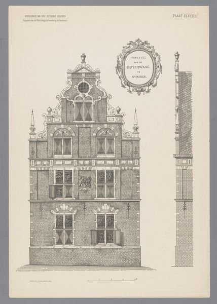 This detailed drawing by Wegner & Mottu depicts the upper portion of the Waag in Alkmaar, capturing its architectural intricacies. Prominently displayed is the coat of arms, a symbol deeply embedded in civic identity and power. These heraldic emblems connect to a broader tradition. Coats of arms, gracing the facades of buildings, link back to medieval heraldry. Originally used on battlefields, they identified knights but soon evolved into symbols of family, lineage, and communal status. This visual language, found across Europe, transcends mere identification; it evokes feelings of pride, belonging, and historical continuity. Observe how the coat of arms, with its stylized beasts and shields, has been transmitted across time, morphing with societal shifts. It reminds us how potent images can be in shaping our collective memory and subconscious understanding of authority. This architectural representation serves as a reminder of the enduring power of symbols to stir emotions and shape our perception of the world.