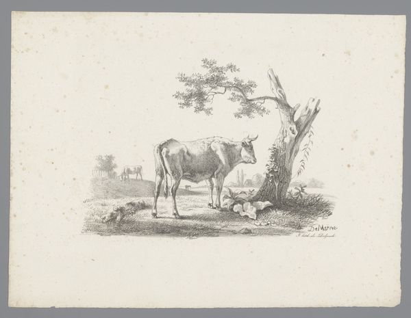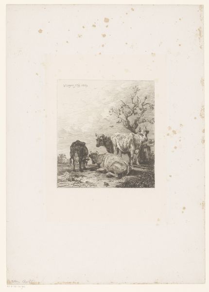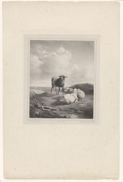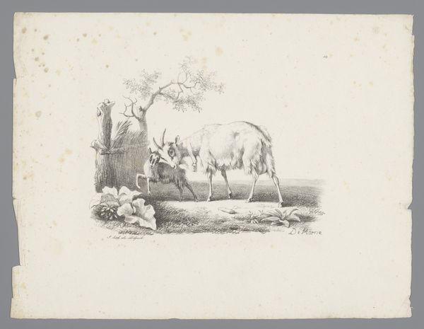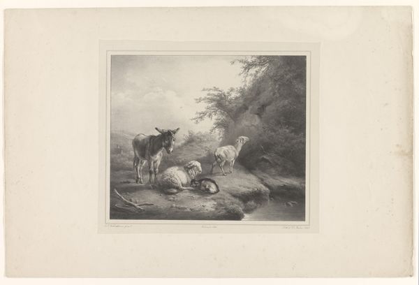 This monochrome artwork by Eugène Verboeckhoven features a cow, sheep, and goat gathered under a tree, rendered with delicate lines. The animals are not mere representations of farm life; they evoke a deeper symbolism. The cow, often a symbol of nourishment and fertility, stands watch, while the sheep, traditionally associated with innocence, rests peacefully. Consider the ‘pastoral’ motif—a recurring theme throughout art history from ancient Greek idylls to Renaissance landscapes. This motif, although seemingly simple, has served as a powerful means to evoke feelings of nostalgia, longing for simpler times, or even a romantic vision of nature. The tree, rooted yet reaching, echoes the ‘axis mundi,’ the world's axis, connecting earthly and spiritual realms. This visual language transcends epochs, resurfacing time and again, evolving yet echoing earlier forms, demonstrating the enduring power of symbols within our collective consciousness.