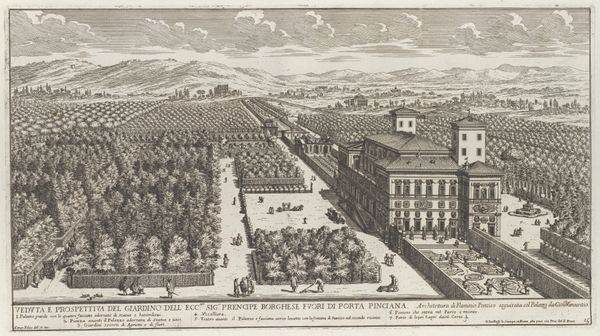 Giovanni Battista Falda created this print of the Villa Borghese in Rome in the second half of the 17th century. The print offers not just a depiction but an idealization of the Villa, reflecting the social and cultural values of the Roman elite during the Baroque era. Note how the geometrical layout of the gardens and the architecture impose order on nature, embodying a worldview that valued reason, control, and classical ideals. Falda's work also documents the Borghese family's power and patronage, as they shaped Rome's urban landscape to reflect their status. Consider that the Villa was not just a private residence but also a space for social gatherings, political negotiations, and artistic displays, underscoring the intermingling of art, power, and social life. To fully understand the print, one might explore estate records, architectural plans, and social chronicles of the time to reveal the complex interplay between art, patronage, and social identity.