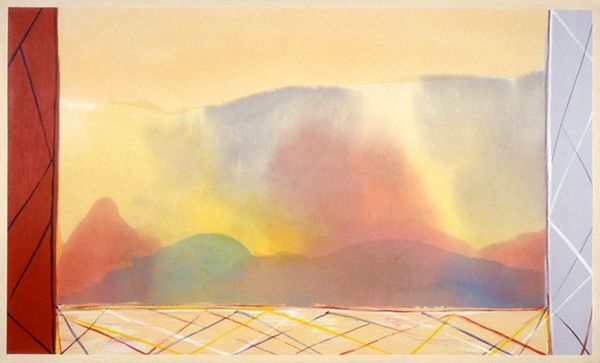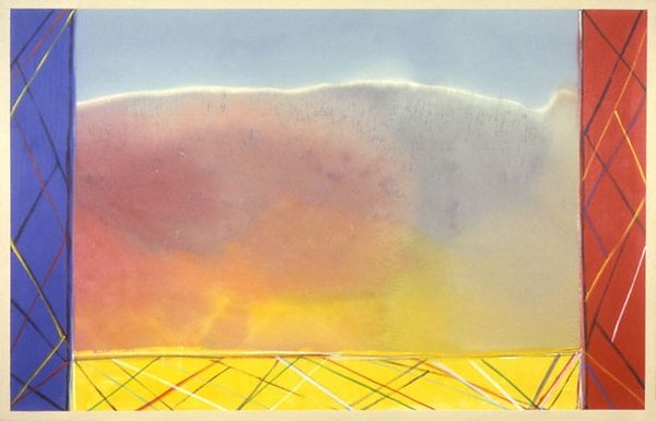 Curator: Immediately, I sense a tranquil mood emanating from this work. The pastel palette evokes a dreamlike quality, almost like a hazy memory of a landscape. Editor: Indeed. What we are observing is Ronnie Landfield’s "A Vision," created in 1988. This mixed media piece, primarily watercolor and coloured pencil, deftly balances the realms of abstraction and landscape. Curator: It's interesting how Landfield uses these washes of color, juxtaposed with those hard geometric lines at the edges. It seems to pull the organic nature of the watercolor into a more structured composition. What do you think he's suggesting? Editor: From a materialist perspective, the application is particularly interesting. Notice how the washes of watercolor appear almost unplanned, allowing the materials to self-organize, guided only by Landfield’s touch. The colour pencils used for lines seem almost performative, showcasing gesture in their hurried strokes. Perhaps, Landfield aims to highlight a dialectic of control and chance? Curator: An intriguing point. And considering that we might interpret it as landscape painting, those lines also function semantically. They enclose and define the vision within the piece. We have the external, architectural frame contrasting with the freedom of the painted vista. Is he asking the viewer to consider landscape itself as always being seen through the grid of an imposed structure? Editor: Precisely, if we scrutinize Landfield's oeuvre and this era, we may discover subtle yet resonant interactions of the social landscape and production of artwork, maybe hinting towards some contemporary dialogue. But overall, the deliberate choices speak volumes. Curator: I find that the power of "A Vision" lies in its ability to resonate on multiple levels, a testament to the artistic ingenuity employed. Thank you, I now have new insights I wasn't aware of! Editor: Absolutely, the pleasure was all mine; analyzing "A Vision" always feels creatively fruitful and insightful.