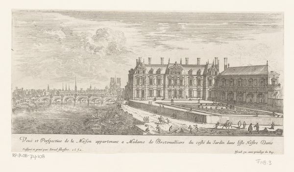 Editor: We're looking at "Koninklijk Paleis in Amsterdam vanaf de westzijde gezien," an etching and engraving made sometime between 1826 and 1839 by J.B. Clermans. It's got this lovely, almost dreamy quality. It feels a little bit like stepping back in time, wouldn't you say? What leaps out at you when you look at this print? Curator: Well, it whispers tales of Amsterdam’s evolving identity, doesn't it? It makes me ponder what it truly means to capture a place. Clermans wasn't just etching stone and mortar; he was giving permanence to a fleeting moment in time. Don't you find that prints offer such a unique opportunity to immortalize a perspective? What does this cityscape evoke in you? Editor: That’s beautifully put. It makes me wonder about the daily lives of people who lived around the palace back then. Were they aware that they were witnessing history in the making? Curator: Precisely! Look at the small figures dotted along the foreground – almost like ants bustling about their day. And the carriage, a signifier of progress and wealth in the 19th century. These are intentional juxtapositions to remind us of the ever-changing flow of life against the backdrop of enduring architecture. Does the palace seem imposing, or is it softened by the quotidian life unfolding around it? Editor: I think softened – the details make it human-scaled. Seeing this has shifted how I see historical cityscapes. It’s not just about grand buildings but about capturing the pulse of everyday life. Curator: Indeed. It reminds us that art, much like a city, is a living, breathing narrative, ever open to interpretation and re-evaluation. It’s fascinating how much we can read in a simple scene.