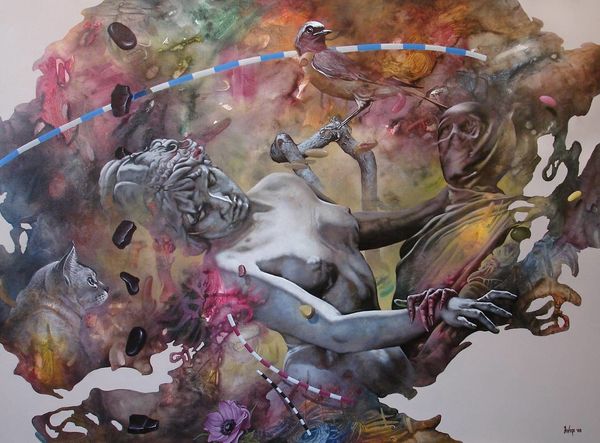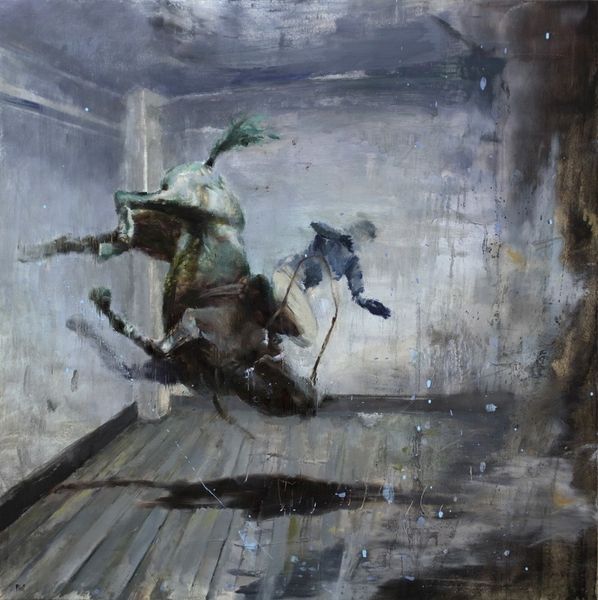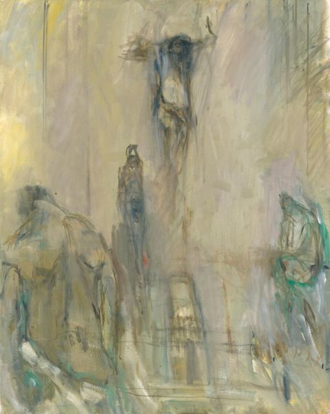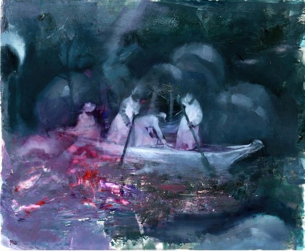 Curator: What catches my eye immediately about this painting is how the figures seem to be emerging from a sort of dreamlike fog. Editor: Exactly! The way the forms sort of dissolve and re-materialize gives it that feel. What’s the piece called? Curator: This is "The World Between," a 2016 acrylic on canvas work by contemporary artist Joshua Flint. It's interesting how the artist uses acrylic in this way. The application is both translucent and opaque at once. Editor: It makes me think of memory. Like fragmented glimpses into the past, refusing to quite solidify into something concrete. It feels so fleeting and… ethereal. It makes me almost nostalgic, which is odd, considering I don’t even know what I am looking at. Curator: The faceless figures intensify that feeling, doesn’t it? I notice how, although they're individuals, they almost blend, which could evoke a sense of interconnectedness that transcends individual identities. Perhaps touching upon our shared human experiences that time obscures. Also, the positioning of these figures is deliberate. Note the individual pulling the sheet or blanket—she seems to guard or hide, as two more are inert below. This suggests relationships: guardianship, caregiving. But what event has just occurred, one is compelled to ask. Editor: Yeah! I see how that central figure interacts with those who seem… unconscious. I like what you say, "obscured," not dead. And then there’s the third figure, in the top right, that you just clocked. The whole composition, combined with these roses throughout the piece, carries such weight. The flowers hint at both love and transience, the temporary beauty, which makes this image so poignant. It's almost cinematic. I find myself inventing a story about these people, these… players. Curator: Yes, "cinematic" indeed! That highlights an underlying narrative structure. A memory unfolding or a myth being reenacted. The absence of distinct features may allow each viewer to project their own story, their own emotional history, onto these figures. They act as containers for our shared experience, allowing this singular narrative to transform into a shared experience. It really shows that Flint's painting isn't just depicting an image. It evokes entire psychological landscapes, does it not? Editor: Absolutely. It's amazing how one image can act like a Rorschach test. Joshua Flint manages to convey so much ambiguity with so few concrete details. I really enjoyed letting it unfold this way.