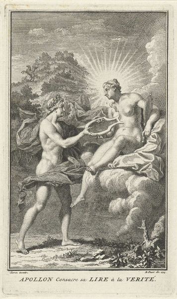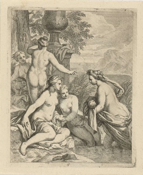 Frans de Bakker created this small engraving titled 'The Marriage of Adam and Eve'. The image presents an opportunity to consider the social and cultural narratives that underpin representations of biblical stories. Here we see a depiction of Adam and Eve in the Garden of Eden. A radiant light shines down upon them, symbolizing divine approval. The image creates meaning through its classical references of the nude body and the iconography of the garden, which was common in European art. The depiction of marriage as a sacred union reflects the religious values of the time in which it was made. To fully understand the cultural context of this artwork, we could research the role of religion in Dutch society. It would also be interesting to investigate the history of marriage as a social institution and how it was perceived and regulated during the time. By studying historical texts, religious documents, and social commentaries, we can gain deeper insights into the meaning and significance of this image.