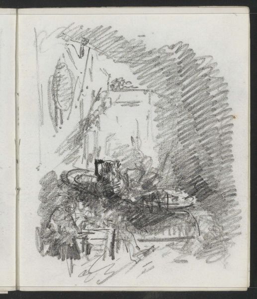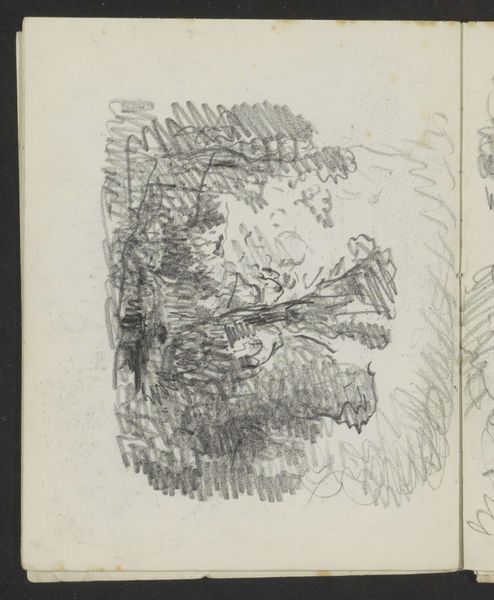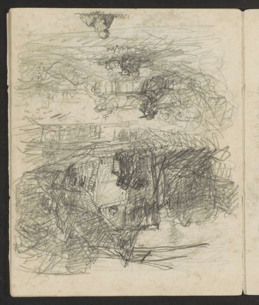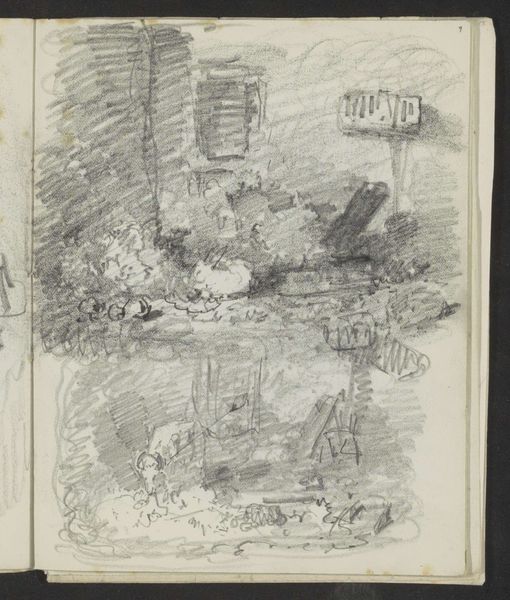 Curator: Welcome. We are standing before Maria Vos's sketchbook page entitled "Stillevens en landschappen met een toren." It's believed these drawings were created sometime between 1834 and 1906, using primarily pencil and pen. Editor: My first impression is one of tentative exploration. There's a charming intimacy here, like peering into someone's private thought process as they experiment with form and composition. The repeated towers carry a sense of almost melancholic contemplation, wouldn’t you say? Curator: Absolutely. Towers throughout art history often symbolize ambition, power, and connection to the divine. They're potent symbols, laden with collective meaning, but what fascinates me is how Vos uses the landscape elements around them. The tower vignettes are positioned in proximity to seemingly random objects like stacks of fruit and platters. Does this perhaps comment on the role and perspective of domesticity versus that of historical, social and institutional dominance represented by these tower structures? Editor: It’s a compelling read. The choice of a simple pencil sketch subverts the grandiose associations usually linked to towers, softening them, bringing them into a relatable, perhaps even vulnerable sphere. There’s also a lovely contrast in technique here. Some drawings are detailed with clear, almost architectural precision, while others feel fleeting, dreamlike. It begs the question of permanence versus impermanence. Curator: I agree. Consider how architectural structures depicted throughout the history of art like the pyramids or Parthenon, have had the distinct function of enshrining ideas in visuality. What does the casual and unfinished rendering of towers tell us about its value system? Is it intentional that the architectural symbols appear dark, gothic, and heavy with scribbles as opposed to the more ethereal depictions of still lifes? Is Vos subtly pushing against a male-dominated aesthetic canon of the time? Editor: Very possible! This fragmented nature might speak to the limited opportunities available to female artists during this period. Sketchbooks allowed space for such private studies of landscape, which in turn could provide women with a level of engagement and creative agency that were restricted. And let’s not overlook the performative and staged nature of the dominant forms of art, especially when they are symbols of state power and the role women played at the time. These pages potentially offered Vos a space of refuge, where artistic freedoms were embraced with uninhibited thought. Curator: A vital insight. In its quiet way, this page embodies resistance. It underscores not only Vos’ artistic journey but also mirrors a wider societal negotiation for visibility and creative liberation. Editor: It certainly gives you a lot to contemplate, doesn’t it? A deceptively simple collection of sketches that really opens up important questions of art, identity, and historical context.
