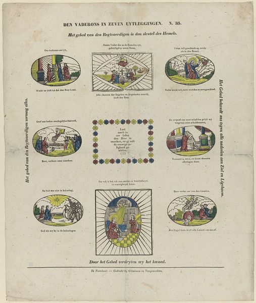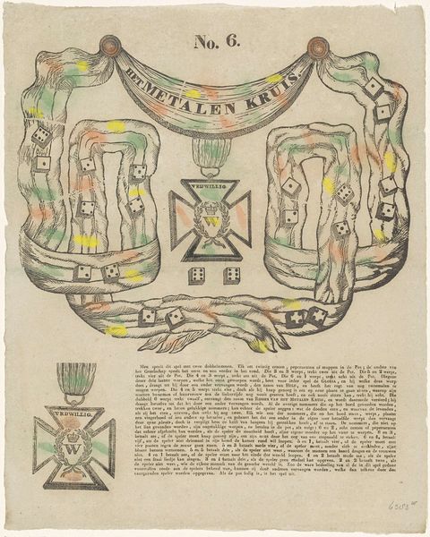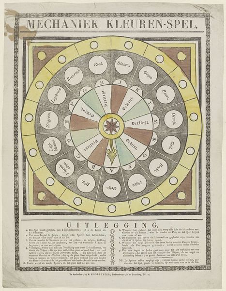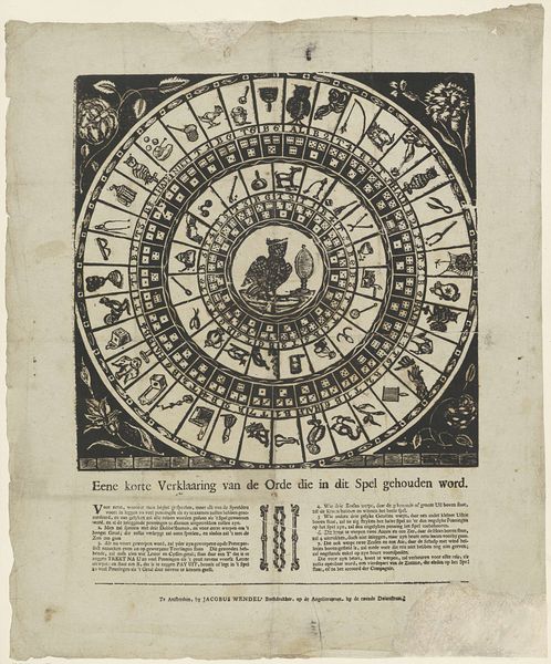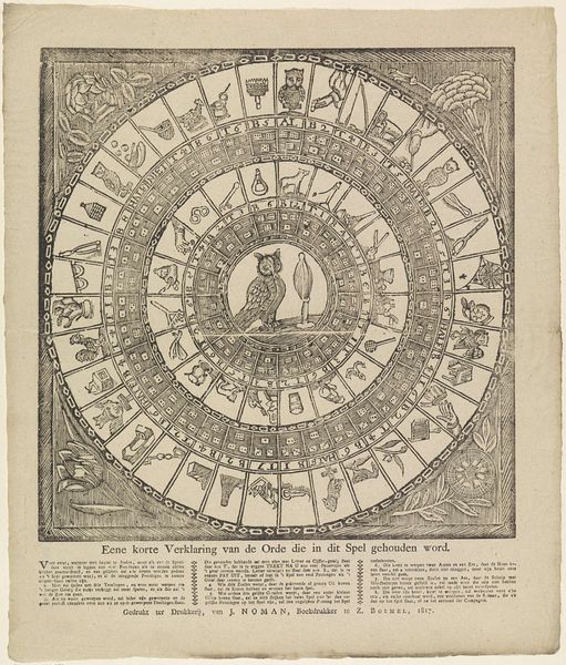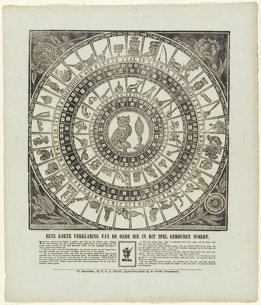 This board game, made by Brepols & Dierckx Zoon, is printed on paper. The game features a circular track adorned with colorful illustrations and symbols, surrounding an owl and a mirror at the center. This lithographic print embodies the democratization of imagery brought about by industrialization. The printing press allowed for mass production, making visual culture accessible to a broader public beyond the elite. The game's playful combination of chance and skill mirrors the dynamics of a burgeoning consumer society. Each throw of the dice represents a transaction, a gamble on fortune. The colorful design and symbolic imagery are all intended to entice players, reflecting the strategies employed by businesses to capture consumers' attention. The material and production processes themselves become part of the game's narrative, embodying the spirit of commerce and leisure in the industrial age.