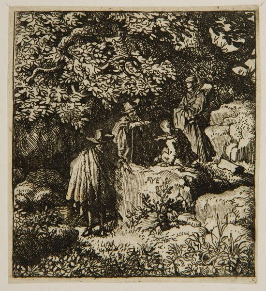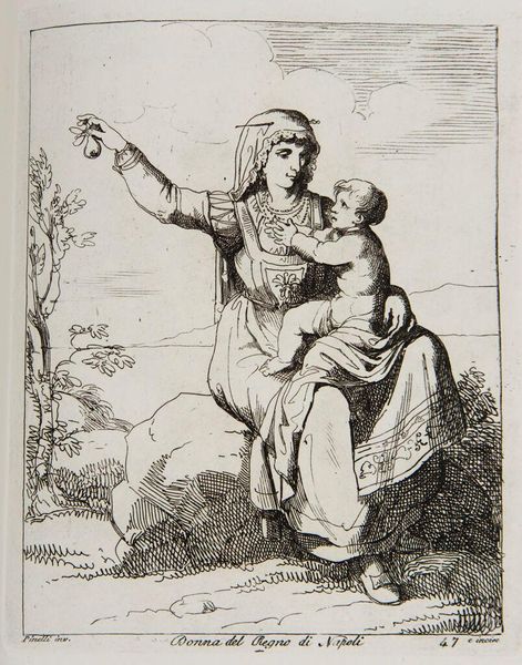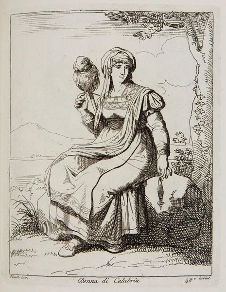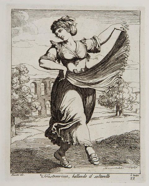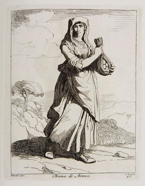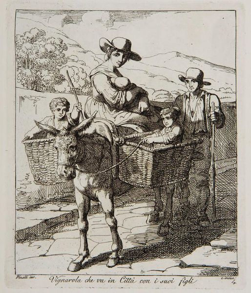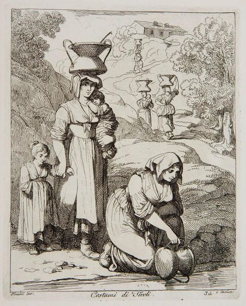 Editor: This is Bartolomeo Pinelli’s "Costumes from Tivoli," a print with no specific date, housed at the Harvard Art Museums. The women carrying loads seem to be central to the scene. What can you tell me about this print? Curator: The print's emphasis on labor and costume points us toward a consideration of social context. The very act of depicting these women as workers, burdens and all, brings into question the traditional boundaries between high art and everyday life. Editor: That makes sense. So, it's not just about the aesthetic but about representing the reality of their labor? Curator: Precisely. Pinelli captures the materiality of their existence – the weight they carry, the clothes they wear, all suggesting a commentary on social and economic structures. Do you think that the artist romanticizes or criticizes their role? Editor: Hmmm, I hadn’t considered that question! I’ll have to think more about it. Thanks! Curator: My pleasure. It's a question worth pondering.