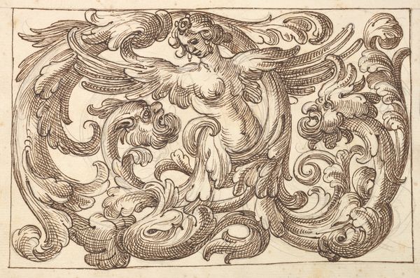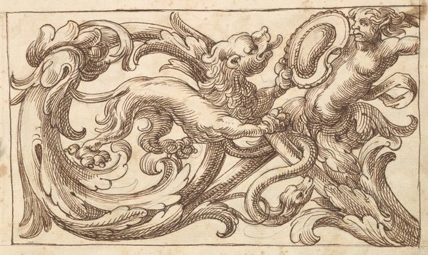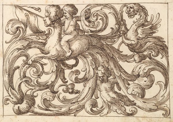 Editor: This pen drawing, titled "Horizontal Panel Design with Two Young Male Figures between Acanthus Rinceaux," dates back to sometime between 1600 and 1650. It immediately strikes me as incredibly dynamic, almost theatrical, with the figures intertwined with these elaborate, swirling leaves. What do you see in this piece? Curator: The immediate visual vocabulary points us to a dance between classical ideals and the burgeoning Baroque. These figures, seemingly caught in a moment of playful struggle, are framed, almost imprisoned, by the acanthus. Think of the acanthus as more than mere decoration. It represents enduring life, immortality; it's a visual echo of the eternal. Editor: So the dynamism I'm seeing is somewhat paradoxical? It's action framed by, as you said, an image of eternity? Curator: Precisely. Notice how the figures, though engaged, are also idealized, their bodies presented in a way that evokes classical sculpture. They become symbols, perhaps of youth and vitality, forever caught in the embrace of something larger than themselves. Editor: It's interesting how the anonymous nature of the artist adds to that symbolic weight, isn't it? They become representations of something bigger. Curator: Yes, anonymity can amplify the universal appeal. It invites us to project our own interpretations onto the work, enriching its symbolic potential. What stories do you see within the frame? Editor: I think the eternal frame highlights how ephemeral and fleeting the two figures are. It definitely enhances the feeling of theatricality for me. It's made me see the whole work differently. Curator: Indeed! Visual literacy helps to see the piece in an altogether different light.