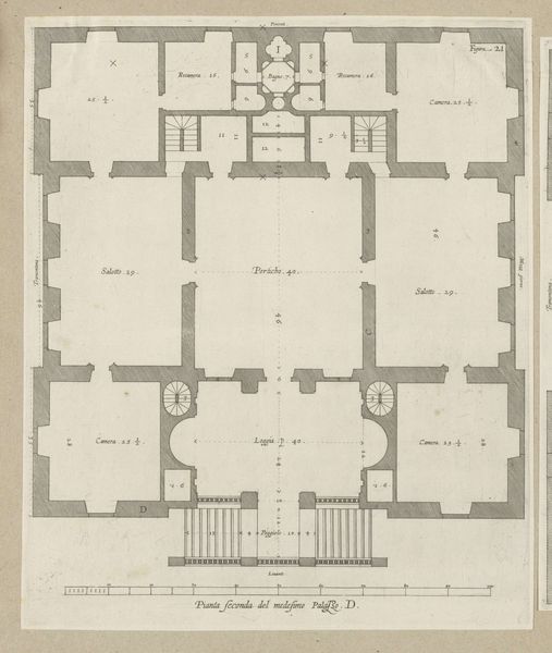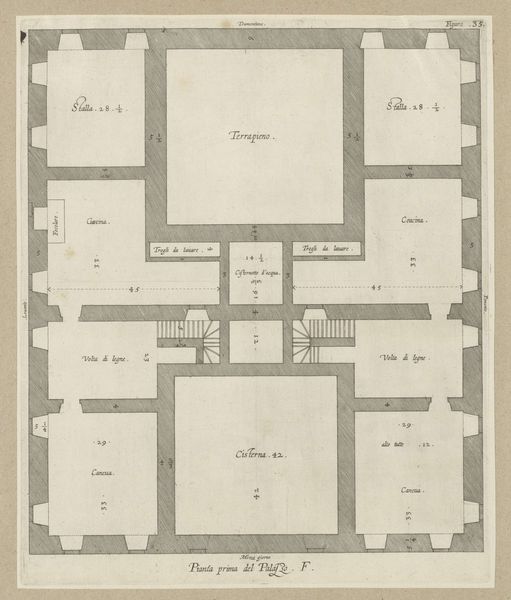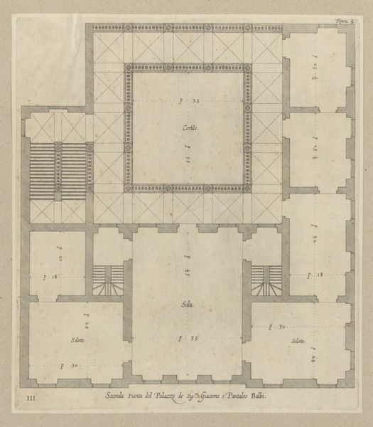 Curator: Before us, we have a drawing titled "Plattegrond van de begane grond van het Palazzo Lercari-Parodi te Genua," or "Ground plan of the Palazzo Lercari-Parodi in Genoa." It's a pen and ink architectural plan created around 1622 by Nicolaes Ryckmans. Editor: It strikes me as a kind of frozen choreography. The precision of the lines and geometric forms hint at the rigid social structures of the time, the separation of space indicating separation of class. Curator: Precisely! Ryckmans meticulously maps out not just the physical structure, but also the intended flow of life within its walls. These spaces weren't just rooms, but stages for enacting social roles, affirming status through carefully designed interactions. Editor: And you can almost feel the weight of expectation bearing down on the inhabitants, knowing their movements would be dictated by such an environment. Consider, too, how such precise architectural drawings are a sign of the times, emblematic of burgeoning systems of control, observation, even governance. Curator: These symbols create power; notice how a centrally positioned courtyard immediately demands attention. In many cultures, symmetry is also an indicator of wealth. How might a wealthy family signal this through the layout and furnishing? It provides social status. Editor: Absolutely. These power dynamics affect inhabitants daily; yet a seemingly harmless map serves to not only maintain social order but normalize the imbalance. The layout creates separation; and yet the same layout provides connections through communal areas for those in the upper floors. Curator: Do you think that someone viewing this document would have recognized a set of social symbols within its geometric makeup? Do you think inhabitants, particularly the less affluent, were aware of this plan's implicit bias, this imposed set of directions? Editor: Absolutely. What initially appears to be an innocuous representation of a building actually served to bolster its structure, acting as both the blueprint and rulebook. It's also about understanding architecture as a means of exerting authority, of visually inscribing hierarchies. Thanks for sharing this piece and your own insight! Curator: My pleasure, it allows us a fascinating window into how social and visual constructs interact, echoing even now in how we build and navigate space today.