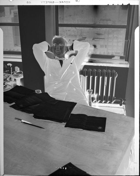 Curator: Jack Gould’s small gelatin silver print, "Untitled (man sitting at desk reading paper and eating sandwich)," now held at the Harvard Art Museums, presents an intriguing moment of everyday life. Editor: It strikes me as both cozy and chaotic. This man, sharply dressed, but surrounded by papers and half-eaten food – there's a relatable tension there. Curator: The image suggests a particular kind of mid-century masculinity – the busy professional, caught between work and leisure. Note the framed portraits in the background. Editor: Yes, who are these guys staring down at him? They almost feel like a jury judging his ability to juggle it all. The sandwich, the paper…it's a potent mix of ambition and appetite. Curator: Considering the social context, the image speaks to postwar ideals of success and domesticity, perhaps with a hint of the pressures those ideals created. Editor: I'm left feeling for him, really. It's a small picture that hints at big struggles of trying to find balance. Curator: Precisely. Gould’s photograph provides a valuable look at the constructed realities of a certain era. Editor: It's a little reminder that even in the most composed images, the mess of life peeks through.