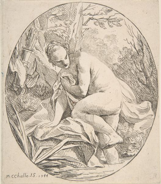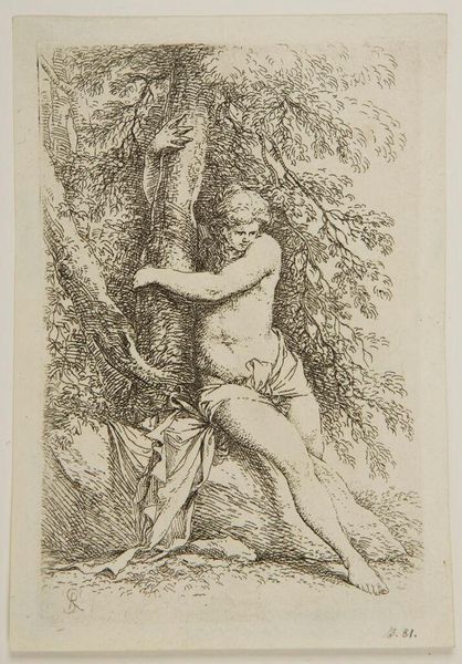 This print, *Hagar in the Desert,* was etched by Louis de Deyster in the late 17th or early 18th century. The composition is immediately striking. A lone figure of Hagar occupies the centre, framed by the stark, linear textures of the wilderness. De Deyster masterfully uses line to create a sense of depth. Note the intricate details of the foliage, contrasted against the smooth, flowing lines of Hagar's drapery. The angular rock formations add a sense of tension, underscoring Hagar's isolation. The etching employs a visual language that invites us to decode its message. Hagar's placement, slightly off-centre, unsettles our expectations. This formal choice may reflect the disruption she experiences, challenging the established order of her society. The starkness of the etched lines emphasizes the human form against the indifferent backdrop of nature. This contrast between the organic and inorganic is not merely aesthetic, but resonates with broader philosophical concerns about humanity's place in the world. The print functions as a site of ongoing interpretation.