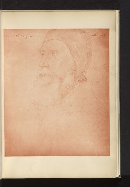 Curator: Welcome. Before us, we have what is catalogued as a phot reproduction of Hans Holbein's portrait of Thomas Wentworth, the 1st Baron Wentworth. The reproduction itself dates before 1877 and it’s held here at the Rijksmuseum. It's rendered in delicate lines. Editor: My first impression is that this image radiates a quiet nobility, even in reproduction. There's an intriguing melancholic cast to his gaze, which invites a deeper questioning of identity and status. Curator: Indeed. Notice the economical use of line, establishing form and volume with sparse yet confident strokes. The modeling is achieved through hatching, observing how the light plays across his features, and his impressive feathered hat. The technique directs us to the sitter’s inherent worth and, in its reliance on the Renaissance ideals of humanism, highlights Wentworth as an individual of notable bearing and significance. Editor: But beyond pure formalism, this work invites a closer interrogation. Wentworth was part of the aristocracy at a crucial moment. Power was shifting with the Reformation and class disparities were becoming increasingly stark. One has to wonder, who did this portrait serve? Who was meant to be reminded of Wentworth's rank and influence? Was this used in the maintenance of structural privilege? Curator: Your points bring forward essential socio-historical concerns, absolutely. Looking at the reproduction as it is here though, divorced from its original context and presented within museum walls, it stands as a testament to the enduring quality of Holbein's artistic method—the balance between form and the idealization of his sitter is captivating. Editor: Captivating, yes, but let's remember that these visual signifiers of power—the noble gaze, the fine attire—also played an active part in legitimizing inequity, something we are still grappling with today. Curator: It’s interesting how engaging with even this red-chalk reproduction of an earlier Holbein portrait opens pathways to reconsidering art historical, technical achievement as well as the weight of the social contexts it occupied. Editor: Agreed. To look closely at art, both for and beyond its intrinsic aesthetic value, ensures that history continues to be a relevant tool in assessing our current conditions.