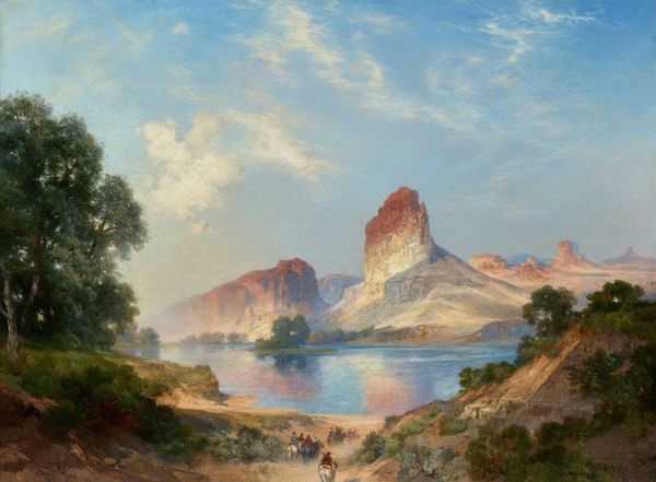 Editor: This is "Green River, Wyoming," an oil painting by Thomas Moran from 1878. I’m struck by how serene it is – the light seems to soften the rugged landscape. What are your initial thoughts when you look at this painting? Curator: Serenity is a key element, yes, but I see something more complicated at play here. Consider the context of its creation: westward expansion was in full swing, driven by a concept called “Manifest Destiny.” How does this painting, with its emphasis on untouched wilderness, function within that narrative? Editor: So, it's not just a beautiful landscape, it's a statement about expansion? Curator: Precisely. Moran was commissioned to create these images, and while undeniably beautiful, they romanticize the West, downplaying the violent displacement of Indigenous populations and the environmental impact of resource extraction. Notice how the figures in the foreground seem small, insignificant against the vastness of the land. Who do you think these figures represent? And whose story is omitted from this version of the West? Editor: I guess I hadn’t considered that the figures could represent the settlers, while ignoring those who already lived there. The sheer scale had just seemed like appreciation. Curator: It’s about who gets to write and, in this case, paint the story. Consider how the "Hudson River School," to which Moran belonged, played a role in constructing a national identity intertwined with the control and exploitation of land. Do you see parallels with contemporary debates surrounding land rights and environmental justice? Editor: That really makes me think about whose perspective is privileged in these grand landscapes, and how they can serve to legitimize specific agendas. Thanks, I definitely see it differently now! Curator: And that different view, I believe, encourages us to question our own roles in perpetuating historical silences, when confronted with similar issues in art today.
