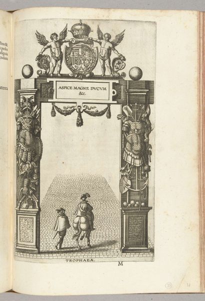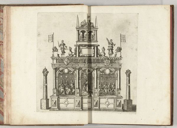 Editor: This engraving by Pieter van der Borcht I, made around 1594, is titled "Triomfboog ter ere van de stad (achterzijde)," or "Triumphal Arch in honor of the city (rear)." The composition feels very staged and theatrical, even performative. What do you see in this piece? Curator: What I see is a meticulously crafted piece of propaganda. Triumphal arches were potent symbols, often erected for victorious leaders or to commemorate significant events. The inscription "ERIGIS ERNESTO" points to its dedication to a figure of power, likely Archduke Ernest of Austria. This arch becomes a stage for legitimizing power, particularly at a time of political upheaval and religious conflict in the Netherlands. The arch’s function exceeds aesthetics; it acts as a political instrument, designed to shape public perception and cement authority. How do the surrounding emblems, like the crane and entwined snakes, inform this triumphalist narrative? Editor: I hadn't really considered the dedication as having such an agenda, more than celebrating a moment in history. With these lenses in mind, the presence of cherubs and heraldic symbols suggests an effort to enshrine this ruler. Curator: Exactly. They operate as a carefully constructed image that invites interrogation. Who does this arch really serve, and whose narrative does it exclude or suppress? Think about the architectural context too: arches often connect disparate spaces and groups. Consider the people walking through the arch in the engraving, presumably subjects of the archduke, what feelings are conveyed as they approach. Editor: Looking at it now, it feels less like a celebration and more like a statement of dominance. It almost seems imposing in light of this intention, I can understand the history of trauma behind celebratory events with similar underlying intentions. Curator: Indeed. Analyzing the intersection of art, power, and social context allows us to recognize how visual culture operates within systems of control. Understanding that can affect the viewers' own relationship with contemporary power structures. Editor: I see, approaching art history with this perspective makes the artwork less about aesthetic appeal and more about broader narratives concerning historical politics and culture. I will have to bring that knowledge with me!