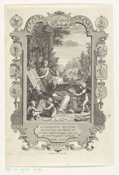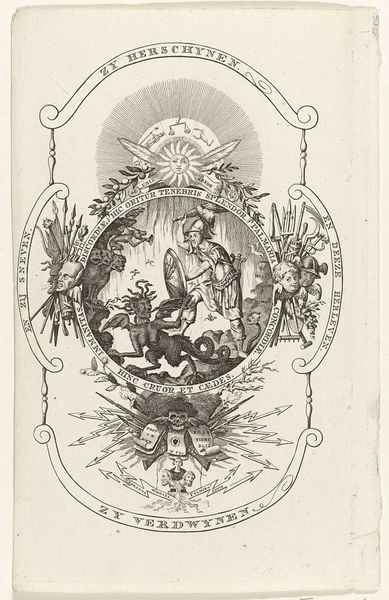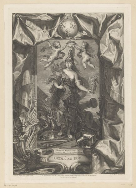 Editor: Here we have "Aankondiging van de geboorte van Maria" or "The Annunciation of the Birth of Mary", an engraving made between 1765 and 1770. It has an old engraving style, seemingly baroque, and is displayed here at the Rijksmuseum. It feels very structured, like a carefully staged scene. What do you make of the composition, the organization of figures and space in this print? Curator: The first thing to note is how Nilson organizes the scene through the interplay of light and shadow, directing the eye strategically. The stark contrast heightens the drama inherent to the narrative and adds visual interest to the print, particularly with the glow and shading across each figure. Note too, the figures occupy different visual planes within the frame, an emphasis on layering. How do you think this structure guides our reading of the print? Editor: I think that our eyes are drawn, or ascend, upwards following this deliberate play with perspective and depth of field from bottom to top? Do the semiotic or iconographic symbols, for example the lamb in the lower right corner, and letter M in the upper portion have meaning here too, beyond mere representational content? Curator: Precisely. These details add a rich dimension of symbolism and meaning. Think about how these choices, and their deliberate arrangement within the pictorial space, reinforce particular themes in Nilson's construction. He seems preoccupied with establishing a formal order reflective of the image content itself. Editor: So the artwork then acts as an organized visual system with carefully positioned figures and symbols contributing to this artistic system that supports the religious and allegorical message? Curator: Exactly. By examining the structure and visual choices, we can interpret how meaning is encoded within this visual representation of a narrative moment, moving beyond merely documenting historical themes, as such, but reflecting meaning using its aesthetic elements as building blocks. Editor: That’s a different perspective. Thank you, this helps me understand formal analysis better.