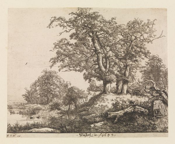 Editor: So this is Johann Christoph Erhard's "Mountain Landscape with Staffage" from 1817, made with etching and lithograph. It’s a very peaceful scene, almost idyllic, but there’s also a slight sense of melancholy. What do you see in this work, particularly considering its historical context? Curator: I see a deliberate construction of an ideal, perhaps even a nostalgic longing for a simpler, rural existence, especially poignant considering the sociopolitical upheavals of the early 19th century. Note the figures integrated, almost dwarfed, within the landscape. How do you read their placement? Editor: I guess it makes them seem vulnerable. It almost romanticizes the past or offers an escape from modernity's issues by diminishing the human presence, which highlights how the characters in the picture interact harmoniously with nature in this landscape. Curator: Exactly. Consider this through a lens of Romantic nationalism, which sought to define a cultural identity rooted in the land. Erhard’s work might be interpreted as promoting a certain idealized vision of national identity linked to the land, but for whom was this image of belonging created, and at whose expense? Editor: Ah, so while seemingly benign, it might reinforce existing power structures by subtly defining who 'belongs' based on a connection to a specific rural landscape? It makes me question whether there were other people living there. Curator: Precisely. It's crucial to remember that romanticized visions often erase complex histories and lived experiences of marginalize people in the real world. Editor: I never would have looked at a peaceful landscape and considered that. Thank you. Curator: My pleasure. Art is not simply to be admired but investigated for its deeper implications.