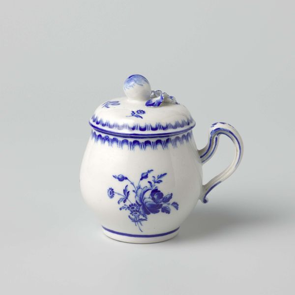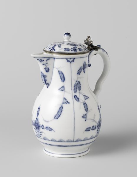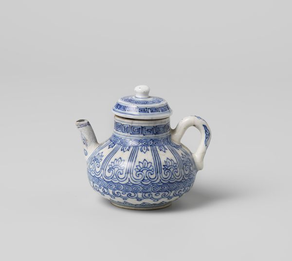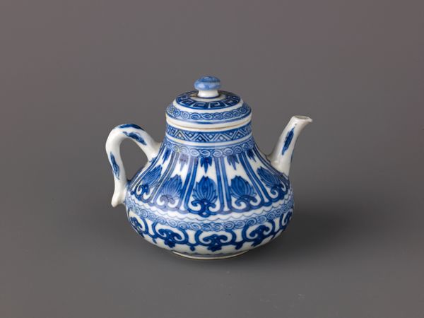 Editor: We're looking at a Chinese, earthenware teapot, likely from around 1700 to 1724. I'm drawn to how intricate the blue floral patterns are against the white. What stands out to you? Curator: Formally, it is the tension created by the stark contrast of the blue pigment on the white ground. Note how the repetitive lotus scrolls and geometric borders interact with the teapot's bulbous form, emphasizing its three-dimensionality. Do you observe the construction of the handle and spout, how they almost seem like afterthoughts? Editor: They do feel separate from the main body, like applied elements. Is that unusual for ceramics of this period? Curator: Perhaps not unusual, but structurally intriguing. The glaze application and the way the handle is attached seem to negate the inherent elegance of the shape, instead creating an object that emphasizes functionality and artisanal skill. Editor: So, instead of focusing on its potential cultural significance, we’re really examining the visual components and how they relate to each other, almost like a study in contrasts. Curator: Precisely. Observe also the somewhat uneven application of the glaze and paint. This, instead of detracting from the piece, accentuates the handmade aspect of its creation. What do you make of it? Editor: It feels much more immediate. I came expecting grand narratives and am instead seeing deliberate choices about form and execution. Curator: The aesthetic lies within those artistic decisions, those relations of color, shape, and texture that generate our experience of the artwork.
