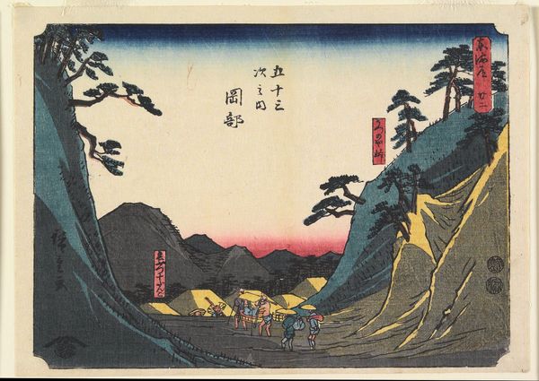 Curator: This vertical triptych by Utagawa Hiroshige, likely created in the 1850s, depicts a Pilgrimage to the Unveiling of Benzaiten at Enoshima. Notice the caves by the main shrine. Editor: It's like a dream! Those mountains look so imposing, and the pilgrims feel both reverent and festive. The little details, the umbrellas...it's gorgeous. Curator: Indeed. Benzaiten is often associated with water, music, and wealth. Pilgrimages to sites like Enoshima were significant events. The rocky landscape itself becomes symbolic. Editor: The composition is so striking, with those looming rock formations and the tiny figures. A reminder of humanity's place in the face of nature's power, but also its beauty. Curator: Precisely. One can see the interplay of Shinto and Buddhist imagery, reflecting the syncretic religious practices of the time. Pilgrimage, a symbolic journey towards enlightenment. Editor: I'm struck by how much it speaks to journeys, both physical and spiritual. It is as if we're invited to join the procession into the unknown and to find something transformative.