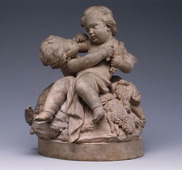 Editor: This is "Children with Shellfish and Vegetables" created by Robert Joseph Auguste, sometime between 1751 and 1761. It’s a marble sculpture. It has a playful feel to it, a sense of abundance and youthful energy. What are your first impressions? Curator: It whispers Rococo whimsy to me. Look at those cherubic figures, practically tumbling over a harvest of earthly delights. I can almost smell the brine of the shellfish mingled with the damp earthiness of the vegetables. Isn't it interesting how Auguste uses a hard, unforgiving material like marble to evoke such a soft, fleshy sensuality? Editor: Yes, it is! It’s almost a contradiction, the coldness of the marble versus the warmth of the subject matter. Was this a common theme during the Rococo period? Curator: Absolutely! This celebration of everyday life, idealized and infused with a sense of joy, is quintessential Rococo. It's not just about the visible…feel the laughter in the carving! These children aren’t just holding shellfish, they're embodying a carefree existence, an almost Edenic innocence. Do you see that in their gestures? Editor: I do now, especially the child reaching out with the bunch of grapes, it's as though they are presenting the abundance they live among. But how much of this was idealised versus representing a reality? Curator: Ah, there's the delicious question, isn’t it? Rococo was all about escapism. The sculpture offers a polished and elegant rendering of life. The kind most could only dream of back then. A very fancy, elaborate dream, I’d add. Editor: I hadn’t considered it from that point of view. Now when I look, I also get a sense of desire – to reach that type of wealth and carelessness. Thanks for shining a light on this for me! Curator: My pleasure. Seeing through art’s own unique lenses, is what makes our world, brighter and a tad bit…surreal!