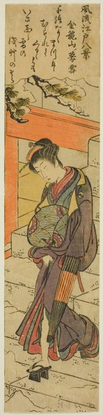 Curator: This elegant woodblock print, created in the late 18th or early 19th century by Kubo Shunman, is titled "Young Woman Walking on a River Bank in Rain." It currently resides here at the Art Institute of Chicago. Editor: It’s striking how effectively the artist conveys the sensation of rain. There’s a quiet melancholy in the composition, emphasized by the subdued palette and the solitary figure. Curator: The “ukiyo-e,” or "pictures of the floating world,” tradition to which it belongs, often depicted everyday life and entertainment. However, I see deeper symbolic elements here. The rain, perhaps representing purification or melancholy, washes over the figure, who seems burdened with unspoken thoughts. Editor: I’m curious about the printing process itself. Creating these lines, the varying opacities…it demanded incredible skill from the woodblock carvers and printers who worked from Shunman’s designs. There must have been many levels of material understanding required of artisans collaborating on the work. Curator: Consider the image of a solitary woman walking along the bank, facing away. It taps into a universal sense of loneliness, something instantly relatable across cultures and time periods. Perhaps she embodies the transient nature of existence, walking toward an uncertain future. Editor: Ukiyo-e prints became commercially available through print workshops, who mass produced designs. One copy, after it leaves the designer’s hands, must then find its purpose through use. I find it interesting to ponder how this particular artwork might have circulated, finding its niche. Curator: Her fashionable kimono and umbrella still speaks volumes. I'm captivated by the way Shunman captures a complex emotional state. A story unravelling with an enduring aesthetic power that speaks across time. Editor: I keep wondering what kinds of pigments Shunman was utilizing at this moment in history, their particular materiality, and also the ways that the original printing context would differ so dramatically from the ways it is framed and consumed today. It feels crucial to attend to those forgotten networks of production and labor.