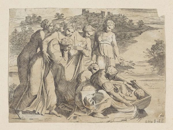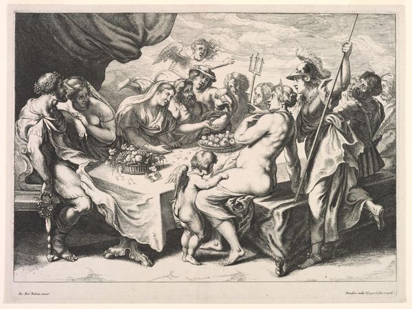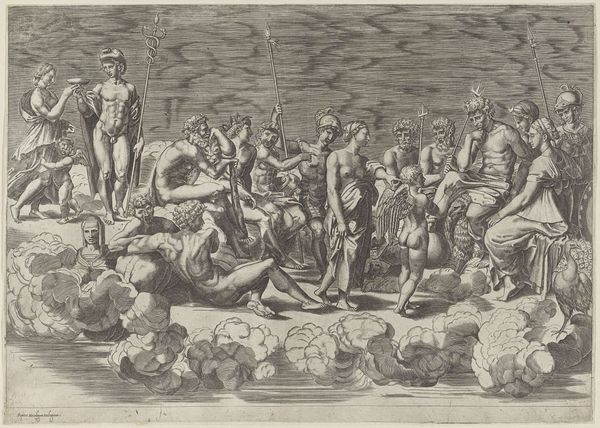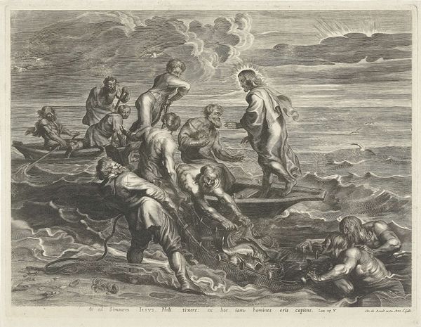 Philips Galle created this engraving, “De Phaiaken dragen de slapende Odysseus naar Ithaka,” sometime in the late 16th century. Galle was a printmaker in Antwerp, a city that served as a major hub for the production and distribution of images at this time. This print depicts a scene from Homer's Odyssey, where the Phaeacians carry the sleeping Odysseus back to his home island of Ithaka. Galle's work reflects a broader cultural interest in classical literature and mythology during the Renaissance. The image is made in the Netherlands, a place known for its strong trade routes and its printing industry. This helped the Dutch to spread information and art. As a historian, understanding this artwork requires us to consider the interplay between artistic production, classical learning, and the socio-economic context of 16th-century Europe. Researching Galle's career and the cultural milieu of Antwerp would further illuminate the meanings and functions of this print.