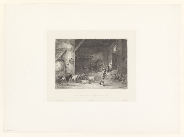 This print, "Geslachte os," was made by Frans Molenaar in the late 19th century, using etching. An etcher works with tools of the printing trade, but also those of a metalworker: acid to bite the image into the plate, and burnishers to scrape back areas that are too dark. The materiality of etching lends itself well to Molenaar's subject. Look closely, and you will see the web of tiny engraved lines, clustered together to form a kind of velvety shadow, which defines the volume of the slaughtered ox. The artist has used the etching needle to describe a scene of labour. The eye is drawn to the labour-intensive nature of butchery and meat preparation. The print not only documents a scene, but also reveals the cultural and social significance of work in the 19th century. It's a reminder that understanding materials, making, and context is essential to fully grasping the artwork’s meaning and relevance.