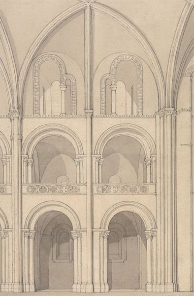 Editor: This is John Sell Cotman's "The Barons’ Hall, Mont Saint Michel," a pencil drawing from 1820. The perspective is striking – almost theatrical. It's quite captivating, actually, but also feels a bit...empty, perhaps? What do you see in this piece that maybe I'm missing? Curator: Empty? Or pregnant with echoes, perhaps? Cotman's pencil isn't just sketching stone here; it's flirting with memory, isn’t it? Imagine the sounds that space has swallowed— the whispers of monks, the clatter of arms. It feels so Romantic, but through the very precise lens of Neoclassicism. It is architecture as a vessel of history. Does that resonate with you at all? Editor: Absolutely. It's that sense of layered time – history imprinted on the very stones. The two figures huddled on the side sort of hammer that feeling home, somehow. Are they resting, or are they perhaps guarding the location? Curator: Mmm, now there’s an interesting thought! Look at how the light dances with those arches. Don’t you think Cotman used the contrast to sort of emphasize the structure's... bones? What secrets do you suppose that space might conceal? It invites stories, don't you agree? Editor: It does. It’s funny, initially it struck me as cold, but hearing you talk about the layers of history and light, it really warms it up. Thank you. Curator: My pleasure! Sometimes a place just needs a little bit of imaginative seasoning, and you, my friend, just added the perfect ingredient.