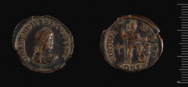 Curator: This is a coin issued during the reign of Constans II, part of the collection at the Harvard Art Museums. It's a small, but potent object. Editor: It feels quite worn, but still manages to convey power. There's a certain resilience that comes through, despite the patination. Curator: The coin's material, likely bronze, speaks to its intended purpose—mass production for trade and administrative function. Think about the labor involved in minting thousands of these! Editor: And its imagery offers insights into the ruling ideology and the role of the Emperor. Who is represented on the obverse and reverse, and what did those images mean to the people who used this currency? Curator: Exactly! The act of creating and circulating this coin reinforced existing power structures. Editor: Considering the context, this coin isn't just a piece of metal. It embodies complex social relationships and power dynamics within the Byzantine empire. Curator: Indeed, this small coin carries a weight of history and material significance. Editor: Examining it encourages a deeper understanding of the people and systems that brought it into existence.