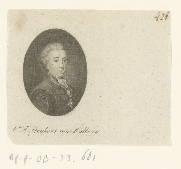 Friedrich Wilhelm Bollinger made this portrait of Hans Rudolf von Bischoffwerder in the late 1700s using etching and engraving techniques. These processes involve using acid to bite lines into a metal plate, which is then inked and printed. The texture of the print, the delicate network of lines, speaks to the labor-intensive process of its making. Bollinger would have needed skill and precision to control the depth and width of the lines, capturing the likeness of the subject while suggesting the textures of his clothing. Prints like this were part of a burgeoning industry, where the division of labor allowed for increased production and consumption of images. While Bollinger was a skilled artist, his work also reflects the social and economic context of the time, as these prints circulated amongst a growing middle class eager to consume images of power and prestige. By considering the materials, the making process, and the social context of this print, we gain a deeper understanding of its meaning, blurring the lines between art, craft, and commerce.