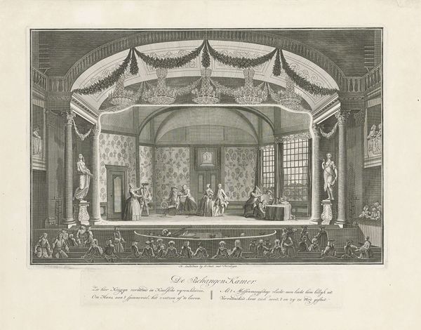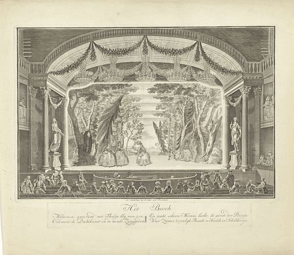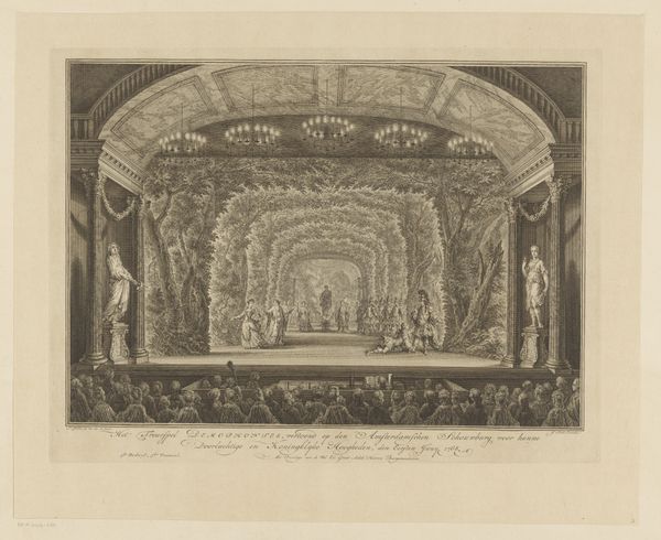 Simon Fokke captured this theatre performance in Amsterdam in 1768, evidenced in fine lines etched on paper. Notice the dominant archway of foliage, framing the stage within a stage. This verdant motif taps into the ancient concept of the locus amoenus, the idyllic, sheltered garden representing paradise or a space of refuge. This symbol has roots stretching back to classical literature and art, where the garden was a site of love, peace, and contemplation. Consider how such a setting recalls Botticelli's "Primavera," where Venus resides in a similarly lush, fertile enclosure. Here, though, the garden is not a natural haven but a constructed artifice, a performance mirroring the performance within. The symbolism shifts: Paradise is now a stage, inviting us to reflect on the constructed nature of our own ideals and pleasures. The performance evokes a psychological resonance, engaging our subconscious desire for harmony even amidst the artifice of courtly life. As we see, the symbol resurfaces, evolves, and takes on new meanings in different historical contexts.