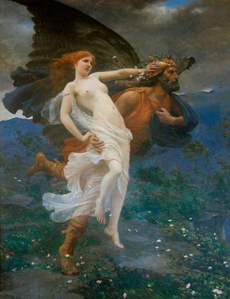 Frank Dicksee painted “The Beautiful Lady Without Pity” using oil on canvas to create this narrative scene. Its dreamlike and ethereal quality evokes a strong sense of romanticism. The composition is striking; the figures are arranged in a pyramidal structure, drawing the viewer's eye from the knight at the bottom to the lady at the apex. Dicksee masterfully uses light and shadow to enhance the emotional depth of the scene, casting the knight in a bright, almost heavenly glow. The use of color is symbolic, with the lady adorned in a flowing red gown that contrasts sharply with the knight's metallic armor, emphasizing the tension between passion and duty. The painting can be seen as a commentary on the seductive power of illusion and the conflict between physical attraction and reason. By using these formal elements, Dicksee crafts an image that is both visually alluring and profoundly unsettling, challenging viewers to confront the complexities of human desire and its potential for destruction. The artwork is a powerful symbol of the late Victorian fascination with beauty, danger, and the irrational.