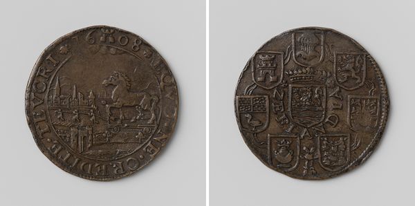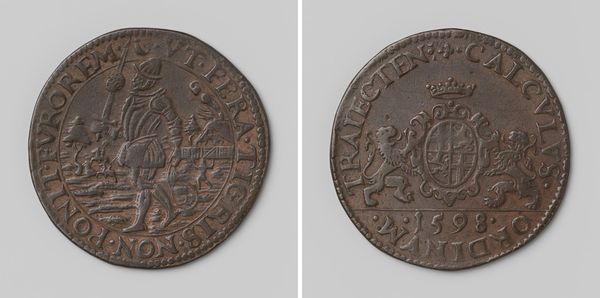 This bronze coin depicts Filips II, King of Spain, and was made for the Chamber of Accounts of Burgundy in Dole. The tactile quality of the coin invites an examination of its formal structure and symbolic resonance. The coin's circular form dictates its composition, divided into obverse and reverse. On one side, heraldic symbols interlace with ornate foliage, creating a dense, almost labyrinthine visual field. The other presents a shield surmounted by a crown, encapsulating power within geometric precision. The artist uses a semiotic system, visually articulating claims of sovereignty through established codes. The coin presents a discourse on power, encapsulating the tensions between centralized authority and regional identity. Consider how the coin’s function as currency informs its design. It serves not only as a medium of exchange, but also a form of propaganda, using visual language to legitimize Filips II’s rule. The circular boundary of the coin underscores the reach and limits of this authority, prompting reflection on the symbolic boundaries of power and representation.