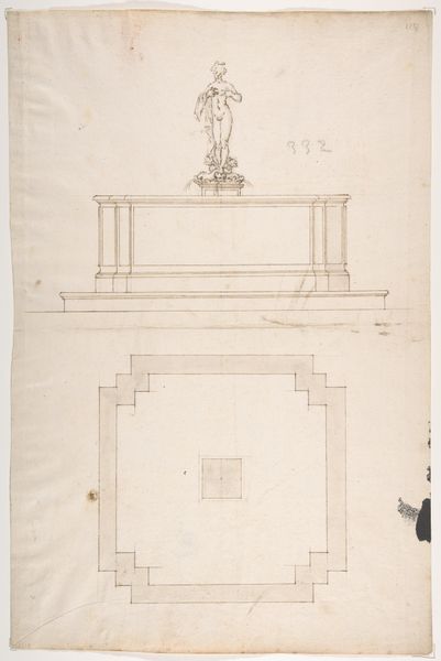 Editor: This is "Design for a Wall Tomb," a 16th-century drawing of architecture. It seems pretty formal. It makes me think about monuments and remembrance, but in a very staged and designed way. What do you make of it? Curator: It is indeed a fascinating reflection of its time. Notice how the tomb design employs classical architectural elements - columns, arches, and decorative carvings? During the Renaissance, there was a real resurgence of interest in classical antiquity, which dramatically influenced artistic and architectural styles. In whose image, and with what purposes in mind, are these public facing symbols displayed? Editor: So, this isn't just about aesthetics, but about using visual language to communicate certain ideas about the person being memorialized? Curator: Precisely! This drawing speaks to how power and status were visually constructed. Consider the tomb's intended location. Would it have been placed in a prominent public space like a church, or within a private family chapel? How might location impact our understanding of its purpose? Editor: A public space would definitely make it about a wider audience, solidifying the family's status in the community, wouldn't it? Curator: Exactly! The Renaissance saw the rise of powerful families who used art as a way to legitimize and broadcast their power. Tombs became statements, showcasing wealth and lineage through carefully chosen iconography. Editor: It's incredible to think about how something like tomb design could be so politically charged! I will definitely consider placement more critically from now on. Curator: Art, even something seemingly simple, never exists in a vacuum, right? And recognizing those underlying societal narratives can enrich our understanding so profoundly.