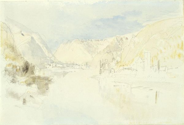 Editor: This is John Ruskin's "Convent and Alpine Pass, Visp, Switzerland." The brown paper really affects the mood. What can we read into the materials Ruskin chose? Curator: The brown paper is quite telling, isn't it? It serves not just as a surface, but as a pervasive ground, almost a manufactured landscape itself. Consider the material conditions of its production, its accessibility, and how it informs Ruskin's depiction of the Alpine pass. How does this relate to Ruskin’s broader social commentary? Editor: So, the paper itself isn't just a neutral base, but part of the statement. Curator: Precisely! It invites us to consider how the means of production, the materiality of the artwork, influences our perception of the scene and its possible connection to the labor involved in both art and life.