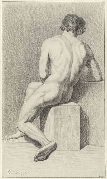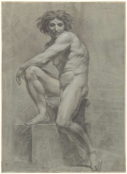 Eugène Delacroix created this Male Academy Figure using brown wash on paper, a traditional medium and method for academic study. The sepia wash, applied in layers, builds up the figure's muscular form and contours, giving weight and depth to the subject. The artist has paid close attention to the play of light and shadow on the model's body, rendered through subtle gradations of tone. The layered brushstrokes and the way the wash settles into the paper create a sense of texture, enhancing the three-dimensionality of the figure. But beyond the artistic skill on display, it is important to reflect on the wider social and economic implications of this type of work. The 'academy figure' was a staple of artistic training in the 19th century, with artists honing their craft by drawing or painting live models. This raises questions about labor, class, and the commodification of the human body. Understanding the materials and processes behind this artwork invites us to look beyond the surface and consider the broader cultural context in which it was made.