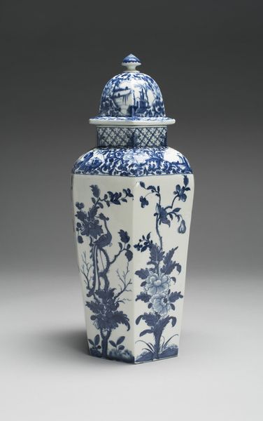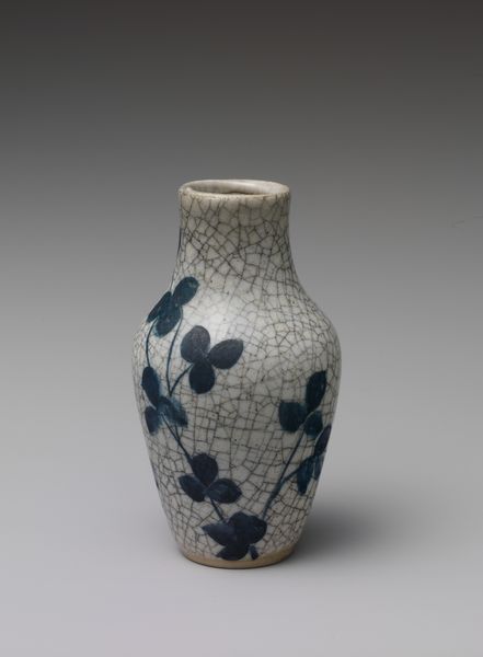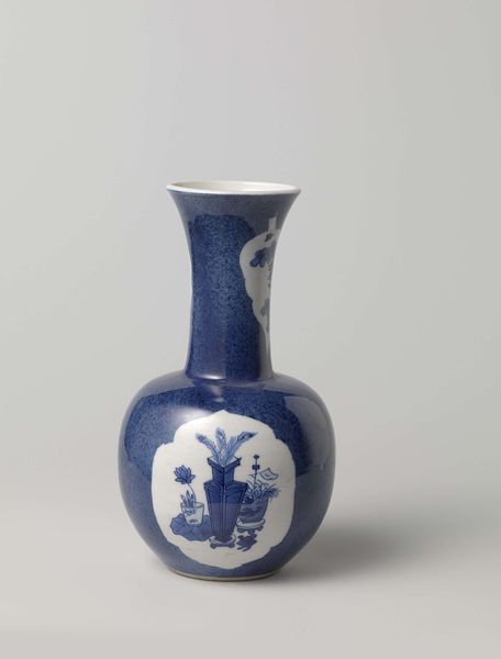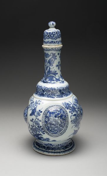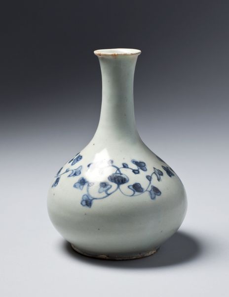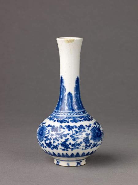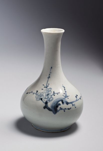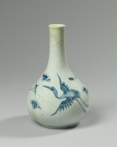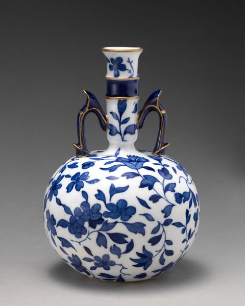 Curator: At the Minneapolis Institute of Art, we have this eye-catching ceramic "Bottle with dragons", believed to originate around the 19th century. What are your first thoughts? Editor: It strikes me as both elegant and forceful. The clean white porcelain contrasted with the swirling blue dragons... there's a restrained energy in its visual language. Curator: Indeed! Dragons in East Asian art symbolize power, good fortune, and protection, so their presence on an everyday object like this bottle imbues it with significant meaning. One can almost see this object being used in a ceremony, in the emperor's residence. Editor: From a purely structural standpoint, the dragon motifs beautifully complement the bottle's shape. They seem to spiral and climb along the rounded body and up the elongated neck. The artist brilliantly used the curvature to enhance the movement inherent in the dragon imagery. The blue against white makes the dragons jump out! Curator: The cobalt blue decoration is incredibly important; historically, the use of cobalt in ceramics represented prestige due to the difficulties in both procuring the materials and achieving the intense hue we see here. The depiction of the dragons also shows a great knowledge of mythology, their traditional association with controlling weather or the sea is also there. The painting, I think, suggests the connection between earthly power and natural forces. Editor: I agree, the interplay is fascinating! What I also notice is how the varying line weights and densities of the blue pigment create depth and texture, offering a sense of dynamism—of these mythical creatures being alive. It shows a real mastery over technique and the medium of ceramic. Curator: These bottles played roles beyond mere containment. They would have carried cultural and philosophical significance. When you consider that ceramics were objects traded across continents, this object embodies a fascinating dialogue between cultures as well as belief systems. Editor: A dialogue preserved beautifully in the language of form and design, connecting us to artistic traditions that endure through time. Curator: Absolutely, seeing the "Bottle with dragons", it shows us not just aesthetic values but historical and spiritual meanings too. Editor: It certainly adds more depth to appreciate its exquisite structure and artistry.