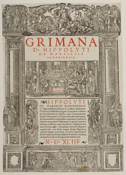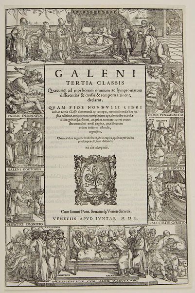 Editor: This is a title page from 1565 for Galen's *Librorum Septima Classis*. The artist is unknown. It's an intricate border surrounding the text with scenes of healing. What draws your eye when you look at its composition? Curator: Note the balanced, symmetrical structure. The four blocks, two on each side, create a visual rhythm. How does the artist's use of line weight affect the overall impression? Editor: The varying line weights add depth. The thicker lines create darker areas, adding contrast. Does this contrast enhance the formality of the piece? Curator: Indeed. And observe how the Giunta mark centers the composition, acting as a focal point. The work masterfully balances detail and clarity. Editor: I see how all the elements create a harmonious visual experience, enhancing the text's presentation. Thank you.