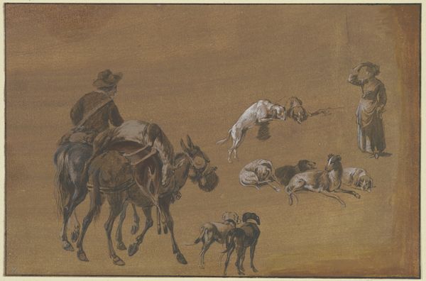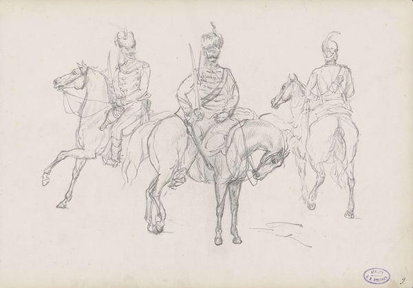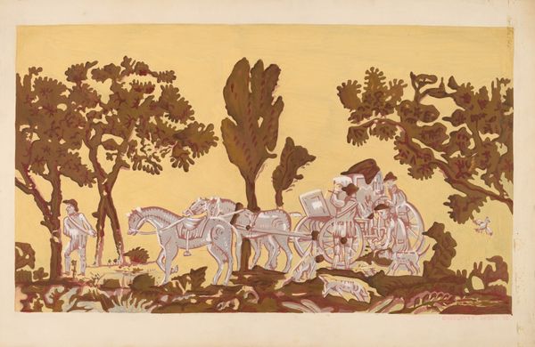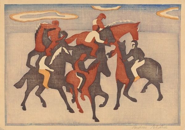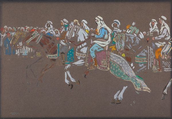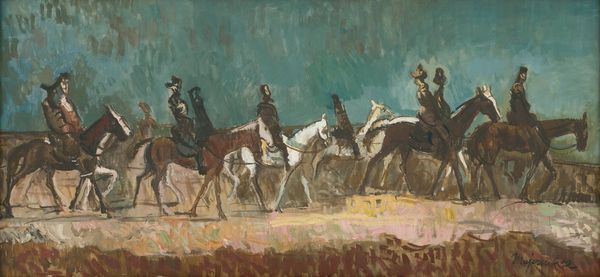 Curator: Let's consider "Pink Sand," created in 1938 by Cyprián Majerník. I find myself captivated by the visible marks of the artist’s process; the layered applications suggest the use of either oil pastel or perhaps watercolors, building up textures, something palpable. Editor: Whoa, a bit dramatic, isn't it? There's a melancholy haze to it, like a forgotten epic fading into twilight. The horses and riders feel spectral, as if they are memories haunting a ruddy landscape. Curator: Considering Majerník's life – his early death at just 29 and his experiences navigating a rapidly changing political landscape in pre-war Czechoslovakia – it's impossible to view this artwork as simply representational. His art actively reflected the inter-war strife by working the canvas like the era's fractured narratives, and using accessible materials democratized art itself. Editor: Yes, perhaps that melancholy I picked up on is tinged with anxiety. But the color is fascinating – the audacious expanse of pink...sand? It's not quite the dreamy sunset kind, but a more earthen, grounded kind. Like sun-baked clay cracking. Curator: The term “pink sand” is somewhat paradoxical to me given Majerník’s context. Sand, as a building medium or element of daily experience, becomes destabilized when shifted to a non-conventional color, pushing against expectations around materiality and labor. Editor: So true, yet there's something so utterly human about trying to make something monumental out of ephemeral materials and impossible realities. "Pink Sand" might be a dirge, but a stubbornly beautiful one at that. It’s almost mocking the authority that its riders have assumed, sitting high atop these noble but colour-washed and flimsy steeds. Curator: Well said, this close look reveals the quiet complexities inherent in Majerník's approach to process and the artwork's position as material evidence. Editor: Agreed, and thinking of this art with you helped sharpen my perception.