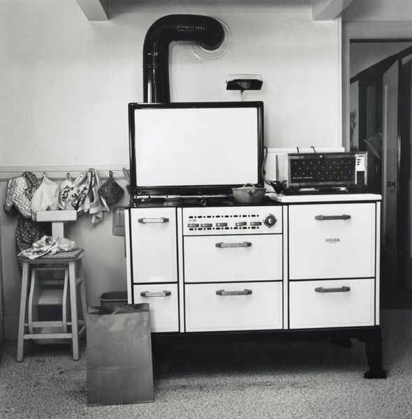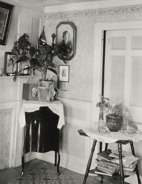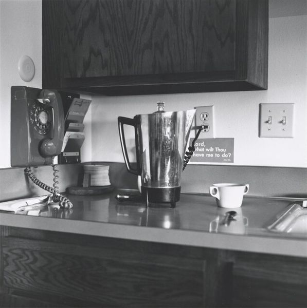Curator: This is Joanne Leonard’s photograph, “Countertop with Premium Crackers and Pills–and Can Opener,” taken around 1976. It offers such an intimate view, doesn’t it? Editor: Yes, an immediate impression is its rather stark domesticity. The muted tones and cluttered countertop evoke a very specific era of mid-century kitchens. There is almost a sense of... melancholic constraint about it? Curator: Constraint, interesting. To me, the arrangement feels symbolic, particularly how the artist places these objects together: the "Premium" crackers, the assorted pills, the ever-present can opener, which is almost an archaic tool today. Each item seems chosen to represent a stage or necessity in daily life. Editor: Precisely. Think about what "premium" implies. A status symbol of accessible wealth is ironically juxtaposed with a row of medicine bottles and tablets. It’s commenting, perhaps, on the pressures on women, the silent epidemic of medicating daily struggles in the home during that period. The crackers could represent the idealized happy home that’s deceptively bland. Curator: That reading resonates. Leonard was active in the feminist art movement, so placing emphasis on these overlooked spaces and objects holds a deeper cultural significance. Even the modest window treatment provides a sense of enforced domesticity, as the window opens not on freedom, but rather, just more of a contained space. Editor: It's impossible to ignore how gender dynamics shaped even mundane experiences within the home. Consider the placement of the can opener, a decidedly utilitarian item; its presence signals repetitive labor, mostly undertaken by women to maintain a home during that time. It is as if that one tool signifies that entire social script. Curator: And that visual anchor connects directly to today. We’re still interrogating assumptions about caregiving, medicine, and so-called “premium” living standards that hide so much. The enduring power comes through its candid, ordinary nature that feels quite radical now. Editor: I agree, recognizing those patterns matters, it allows us to reevaluate assumptions about how much has truly changed within gendered labor structures and societal expectations around well-being. It’s a humble photograph with powerful contemporary echoes.