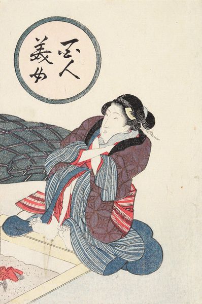 Editor: This is "Black Lacquer Box with Koto Strikers," a woodblock print by Katsushika Hokusai from the 19th century, residing at the Minneapolis Institute of Art. The stark contrast between the black lacquer and the soft colors of the interior lining and koto strikers is quite striking. What visual elements stand out to you in this print? Curator: Indeed. Formally, the composition arrests attention through its geometric rigor. Notice the sharp angles of the box contrasted with the softer, more organic shapes of the strikers and their subtle gradation. Hokusai masterfully employs negative space to draw the eye, creating a dynamic tension within the work. The flat, unmodulated color fields, particularly in the box, serve to emphasize its solid form and geometric precision. Observe also the decorative patterning within the box; it introduces a subtle visual complexity that enriches the otherwise austere design. How do you interpret the use of these specific shapes? Editor: I see the way the straight lines highlight the shapes more clearly now that you mention it! Are those shapes, alongside the contrast, meant to reflect some specific school of art? Curator: One could consider this print within the larger context of ukiyo-e, noting the reduction of natural forms to their essential, almost abstract, components. It’s not directly representational; instead, the print focuses on capturing the *essence* of the box and its accoutrements through a considered manipulation of form and color. Hokusai guides us to the very basic elements of lines to represent things, which would likely be lost in another less rigid style. Editor: This focus on the line and form certainly makes this work feel a lot more impactful. Thanks, that really opened my eyes. Curator: It was a pleasure to analyze its formal elements with you, too.